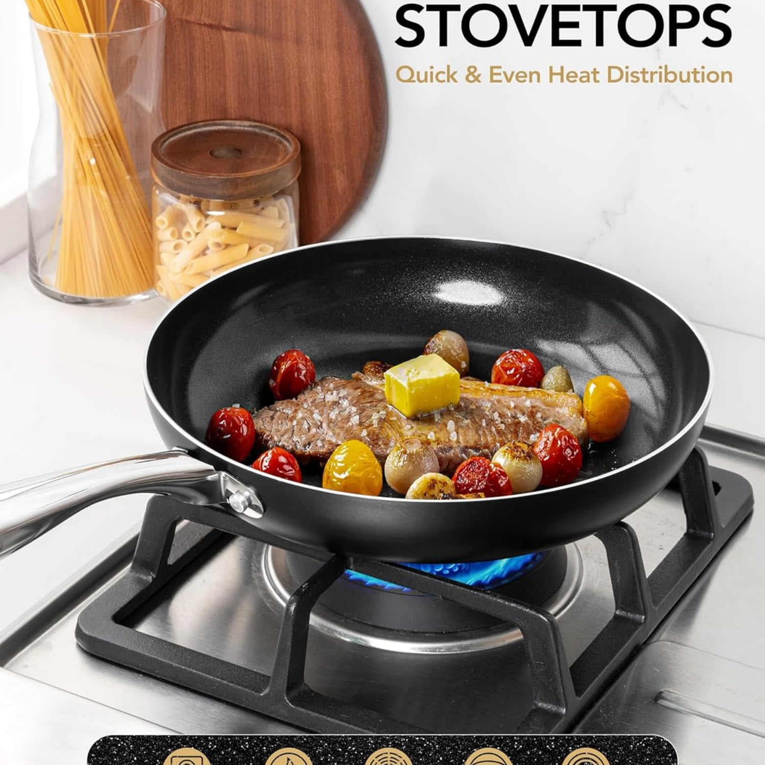 - All-Cooktop Compatibility – Our non stick pan can be used on all cooktops, including gas, electric, induction, and glass. Experience effortless cooking convenience on any cooktop types.