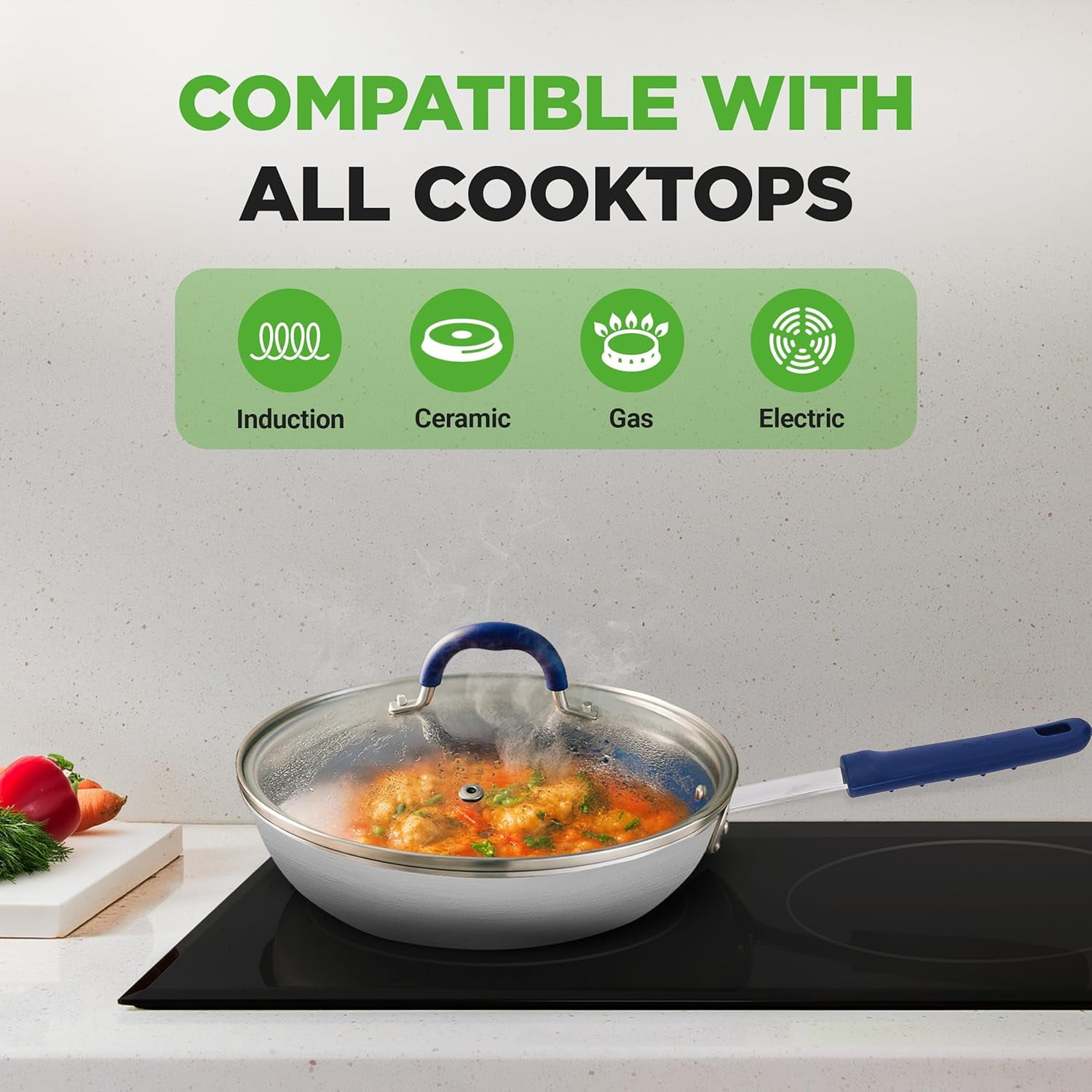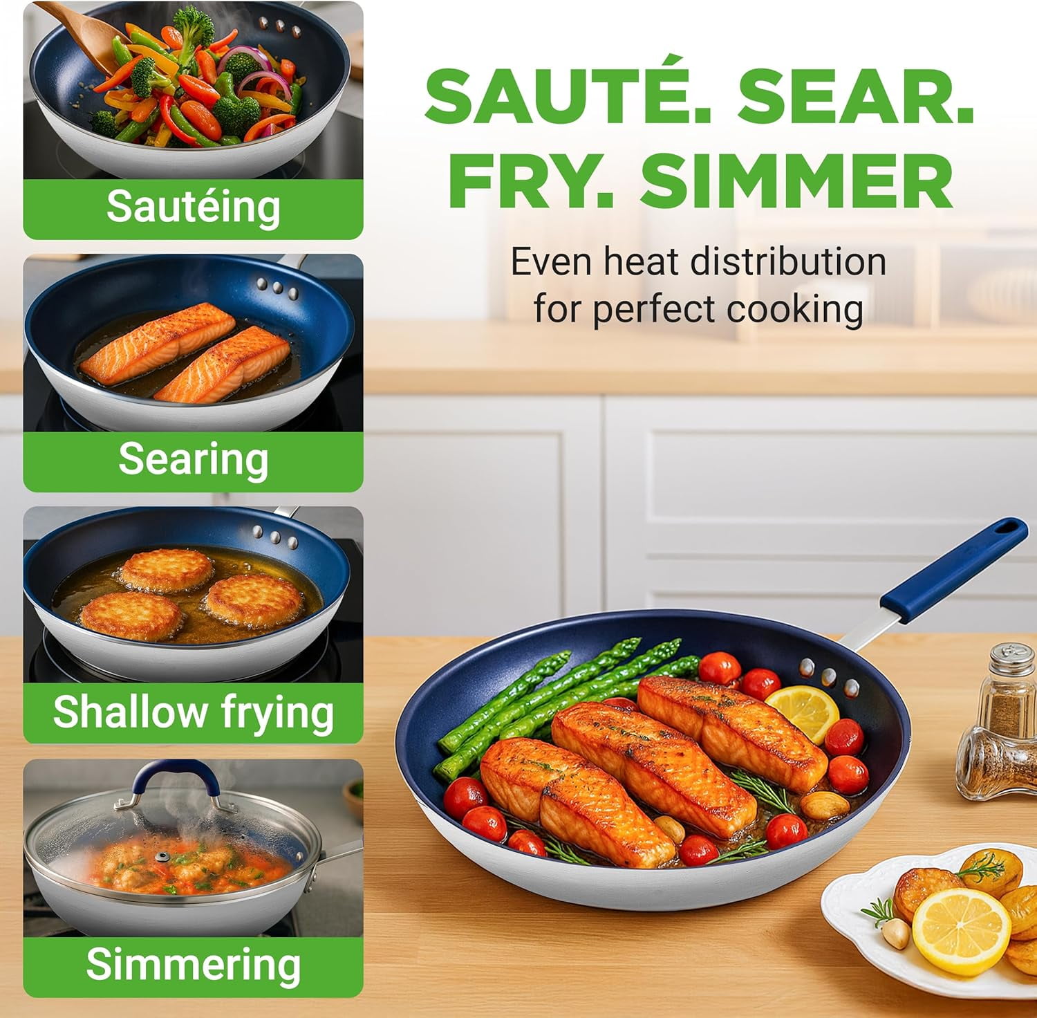 12 Inch Fry Pan with Lid – Large Nonstick Skillet, Ceramic Coating, Induction Base, Blue Silicone Handle, Stain Resistant