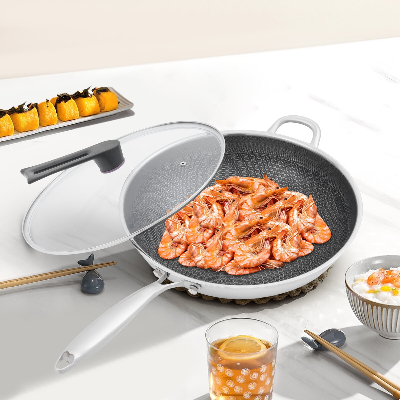 14.2″ SUS316, Stir-Fry Pan with Tempered Glass Lid & Nonstick Surface, 7-Layer Induction Compatible Frying Pan for Home & Restaurant