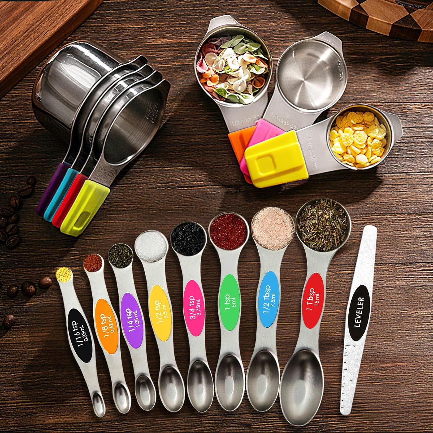 16PCS Magnetic Measuring Spoons and Measuring Cups Set, 7 Double-Sided Spoons& 1 Leveler and 8 Measuring Cups, Multicolor, Stainless Steel, Fits Spice Jars, Large Capacity Measurement