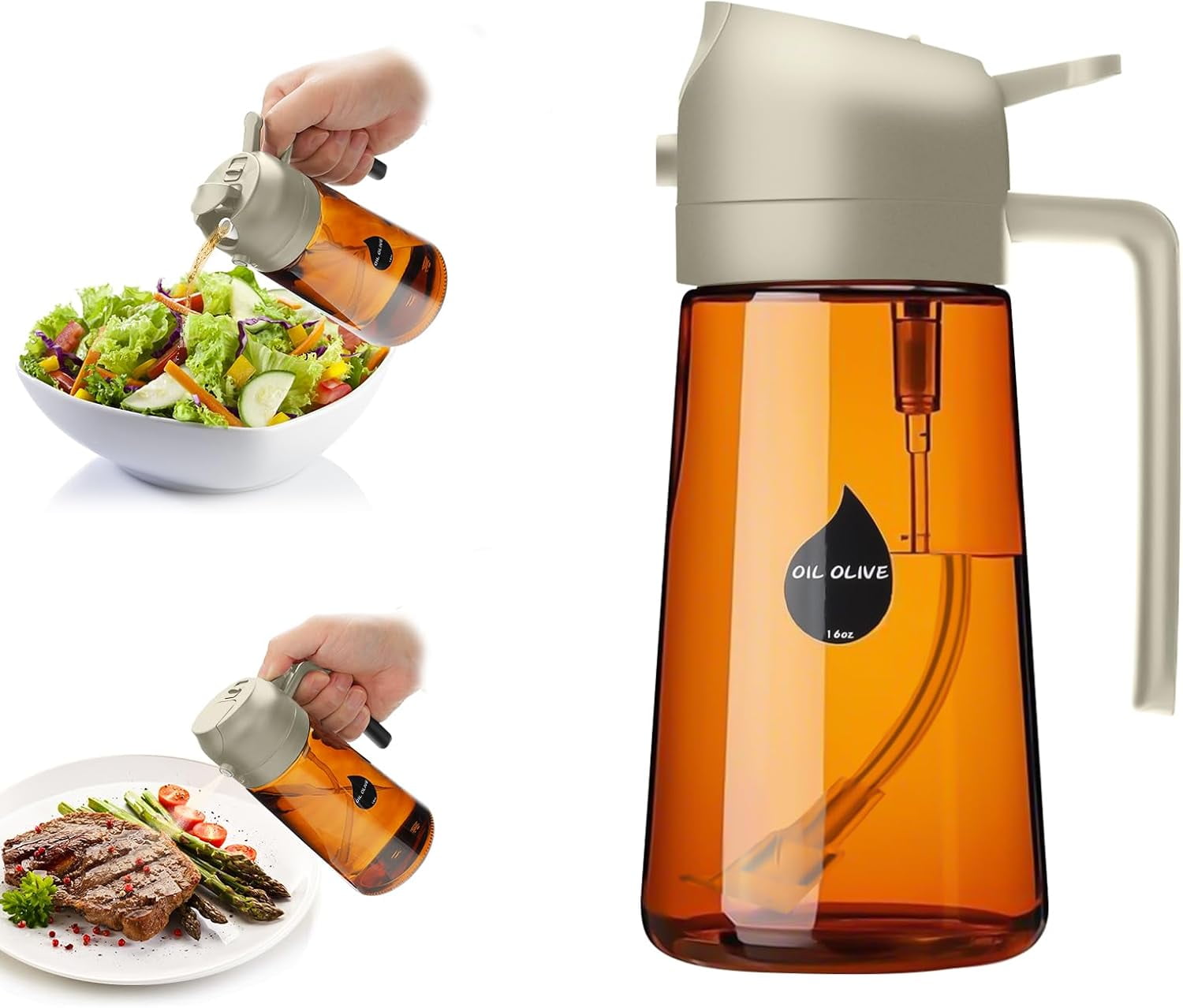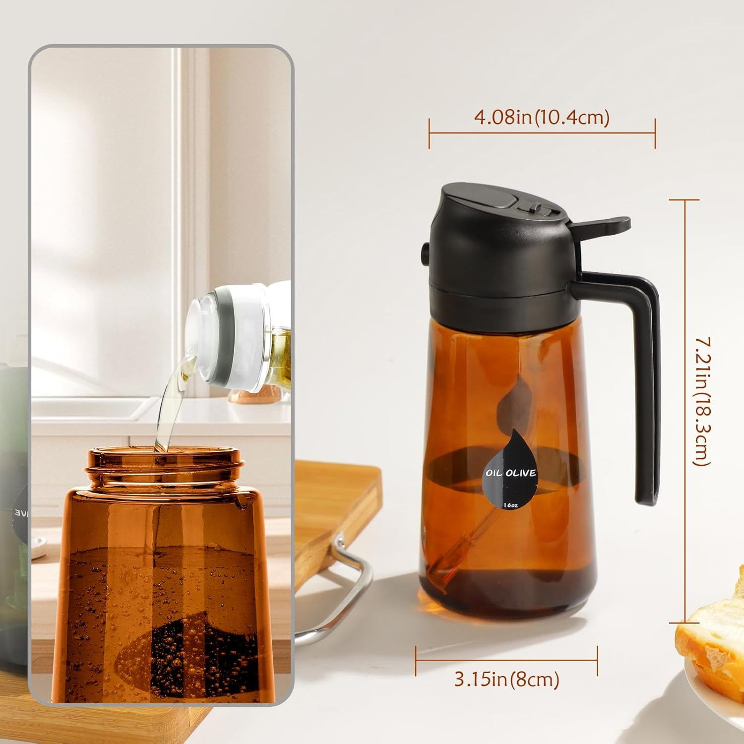 2 in 1 Oil Sprayer for Cooking, Olive Oil Dispenser Bottle for Kitchen Spray and Pour, 16oz/470ml Light-Blocking Dark Amber Glass Brown Bottle, Food-Grade Oil Mister for Air Fryer Black Cap