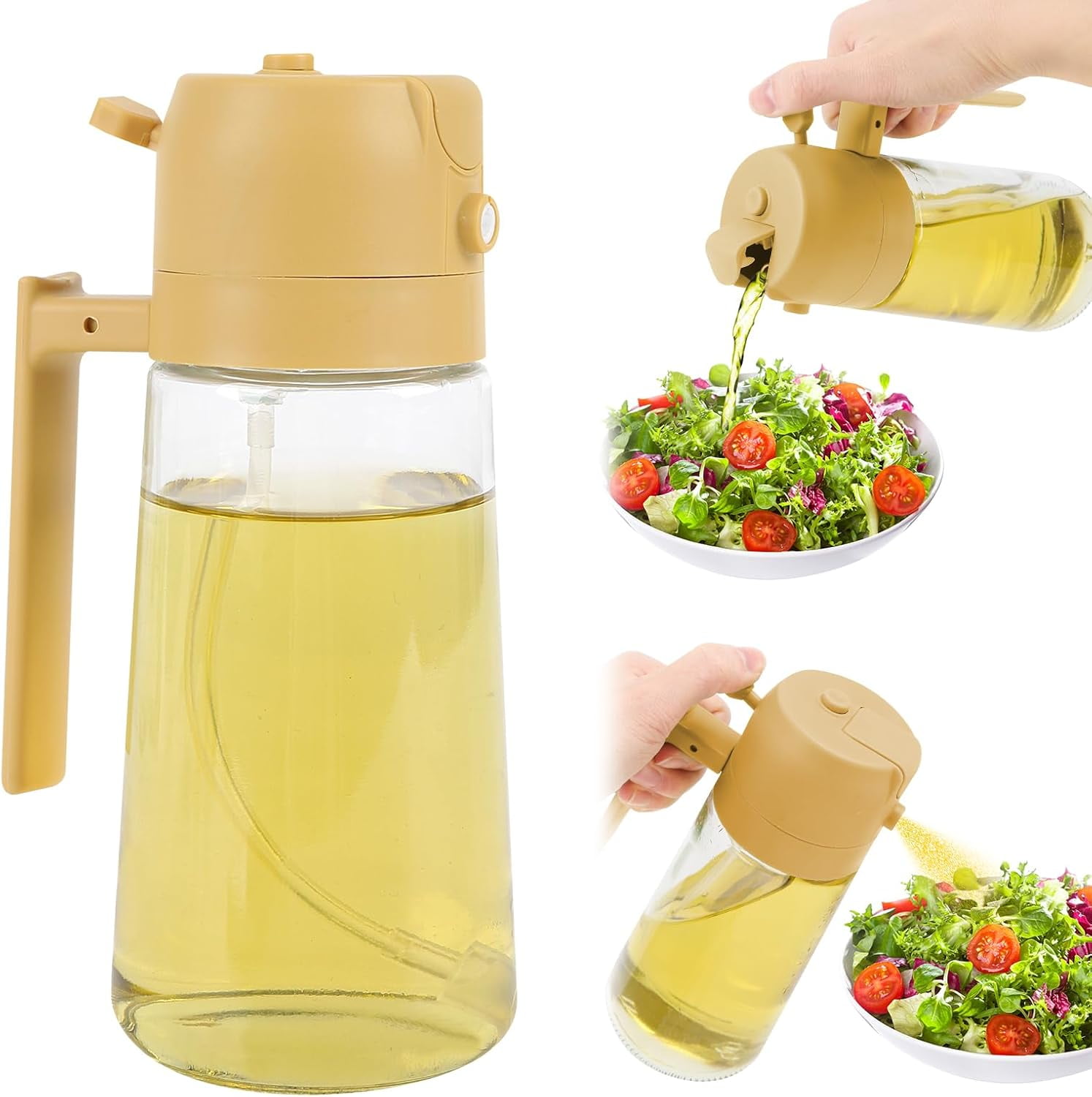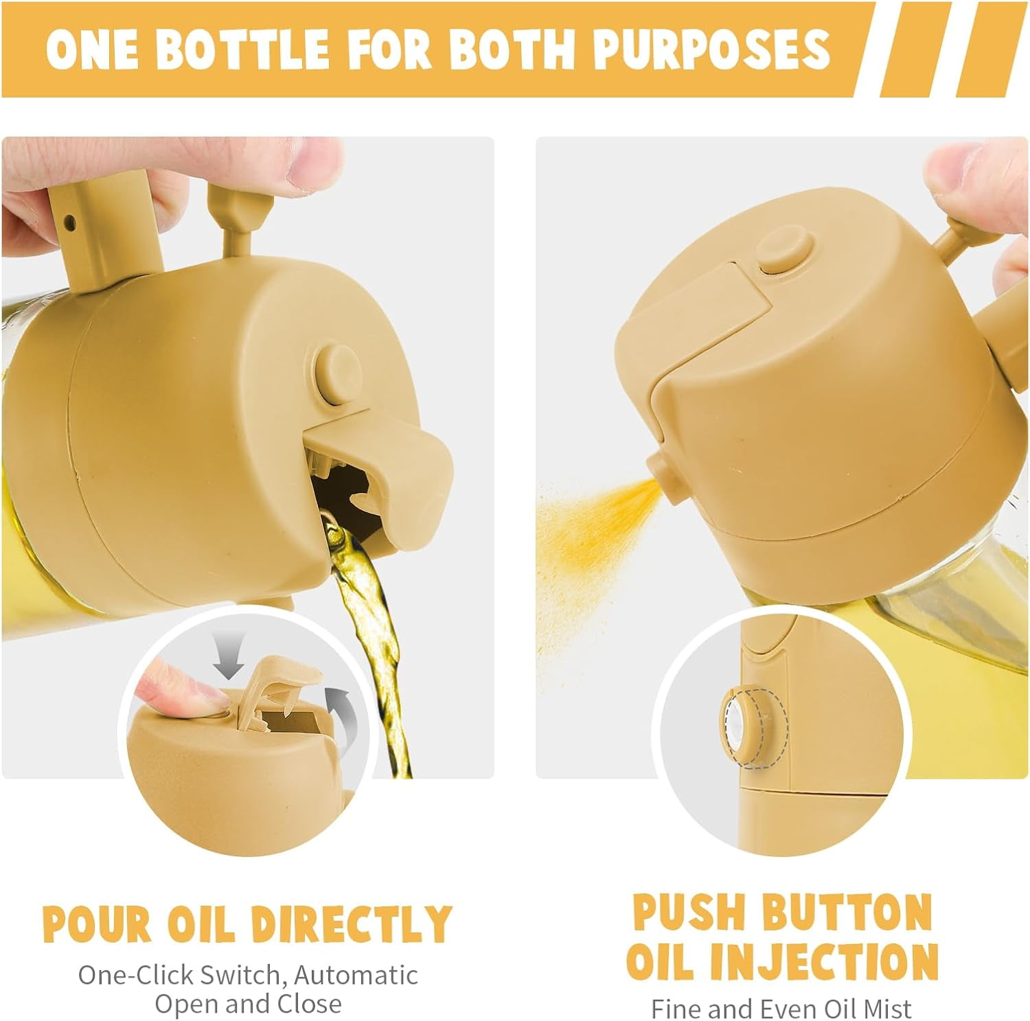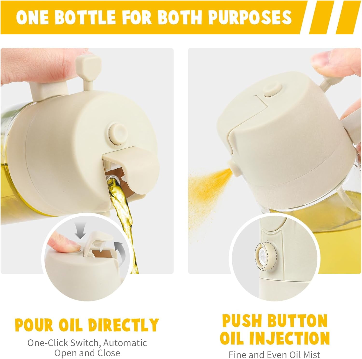 - Experience the convenience of our 2-in-1 Oil Dispenser and Oil Sprayer. Perfect for precise cooking oil control with continuous spray and pour functions