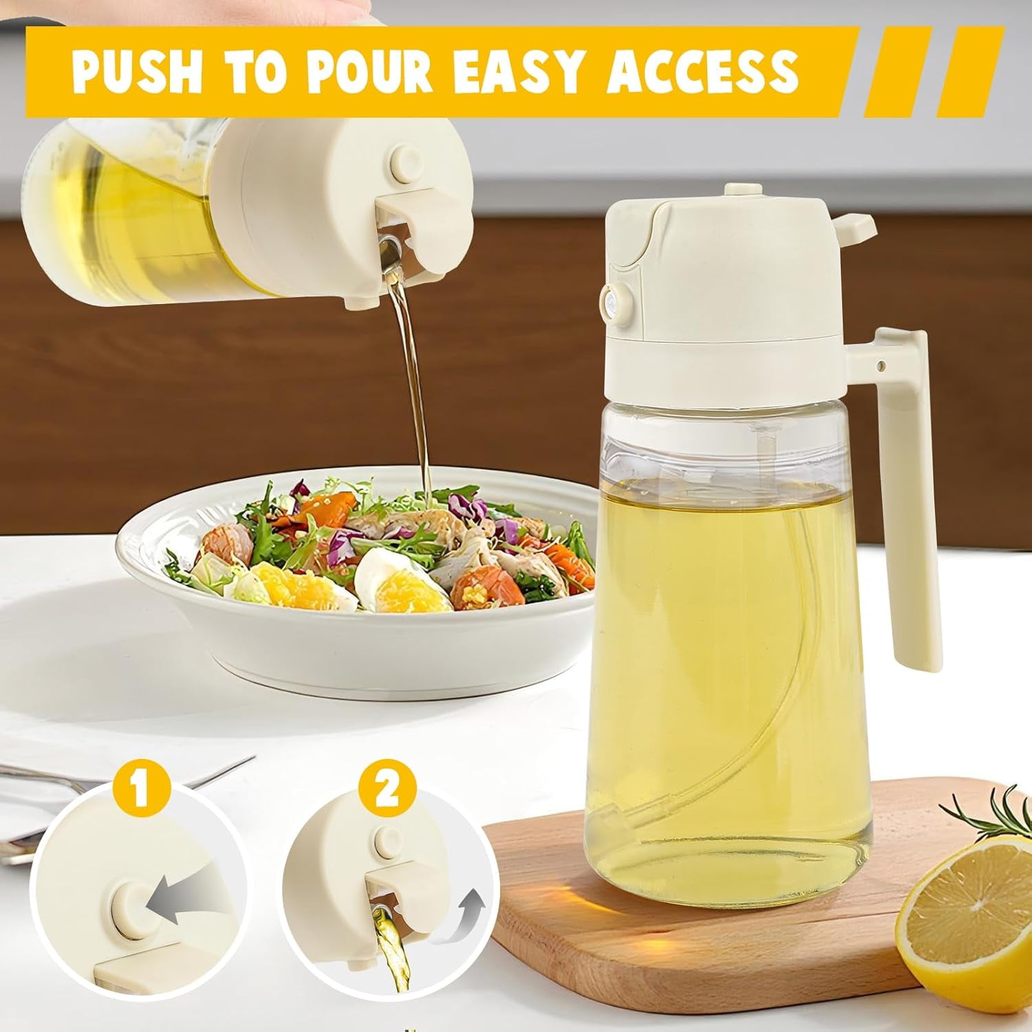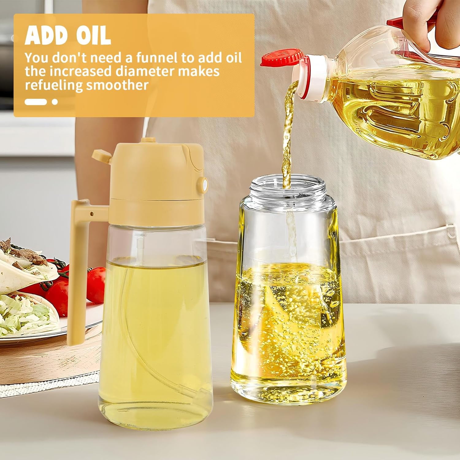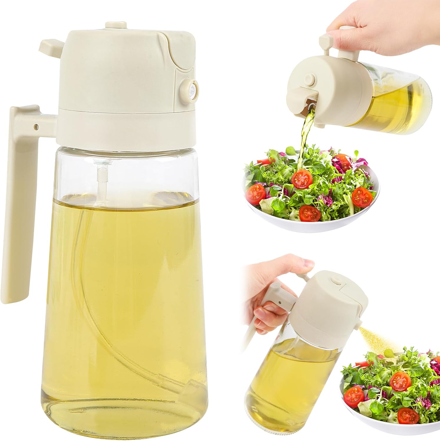 - Experience the convenience of our 2-in-1 Oil Dispenser and Oil Sprayer. Perfect for precise cooking oil control with continuous spray and pour functions