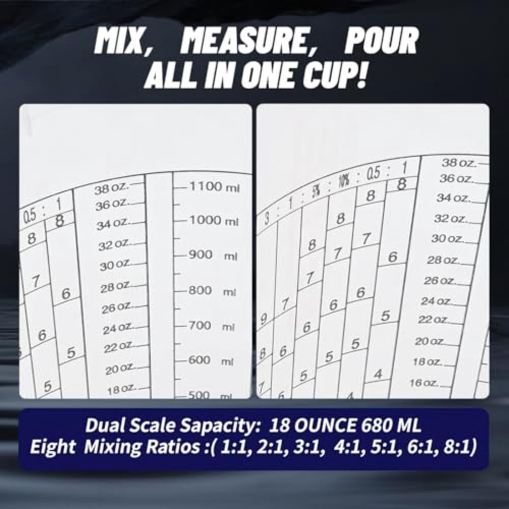 Accurate Measurement and Versatility:The paint mixing cup set by , 38 oz, includes 60 sets with clear graduations for precise mixing every time. Ideal for a variety of paints, resins, and acrylics. Supports 8 mixing ratios (1:1, 2:1, 3:1, 4:1, 5:1, 6:1, 7:1, 8:1) to meet different project needs Comprehensive High-Quality Accessories:This Mixing Cups set includes 8 lids, 5 funnels, and 5 mixing sticks to streamline the mixing and transfer process, reducing waste and mess. Enhances work efficiency and minimizes material loss, while the lids ensure the contents remain uncontaminated and fresh for future use Durable Material:Made from high-quality polypropylene, these cups are resistant to a wide range of chemicals, suitable for long-term storage and repeated use. Ensures safety and durability for mixing various substances Easy to Clean and Store:The design is simple and easy to clean, reusable, and environmentally friendly. Each set with lids for convenient storage of unused paint or resin, keeping your workspace tidy and organized Suitable for Professionals and DIY Enthusiasts:Whether for professional workshops, garages, or DIY lovers, the paint mixing cup set provides a professional-grade mixing experience. It’s perfect for everything from small DIY projects to large-scale industrial work