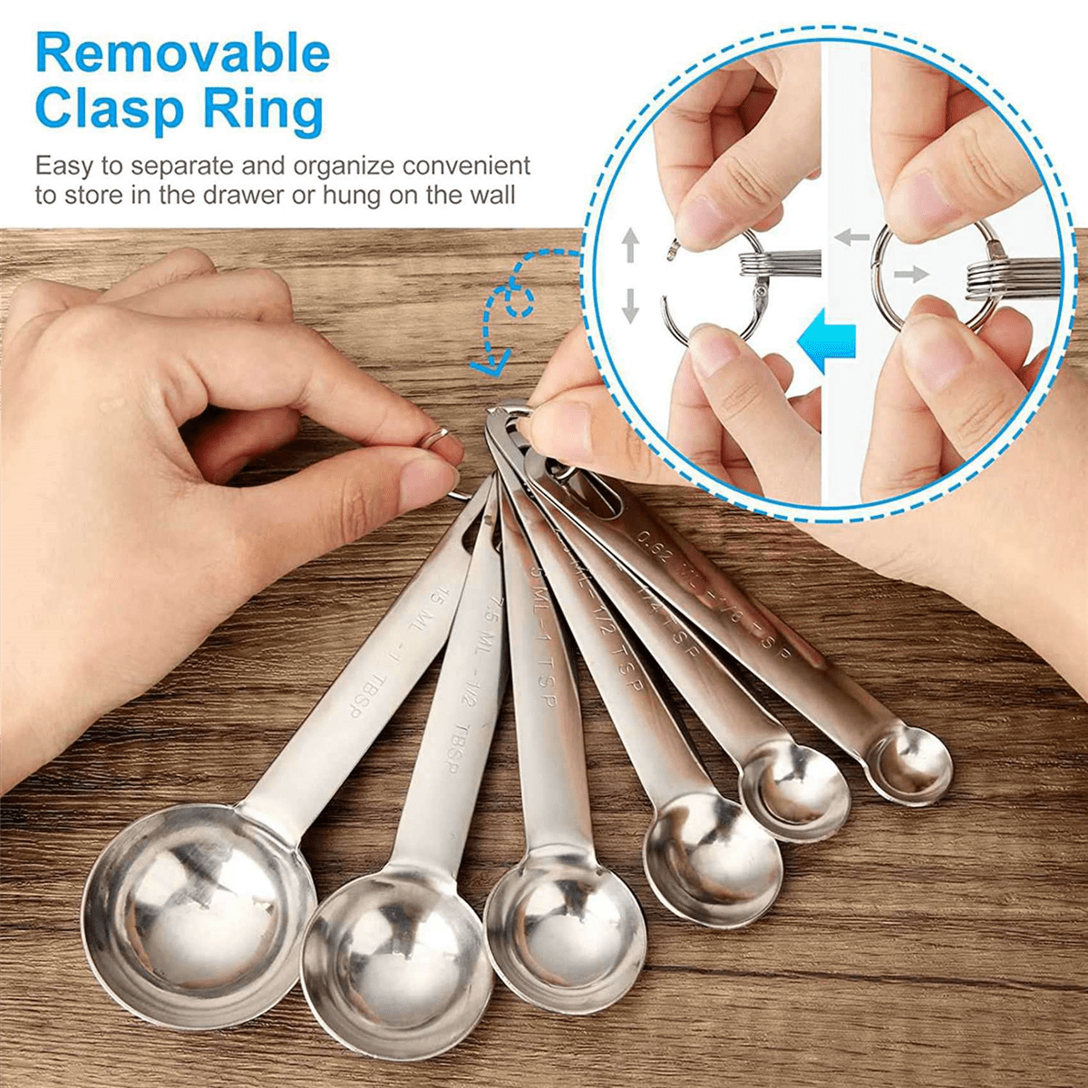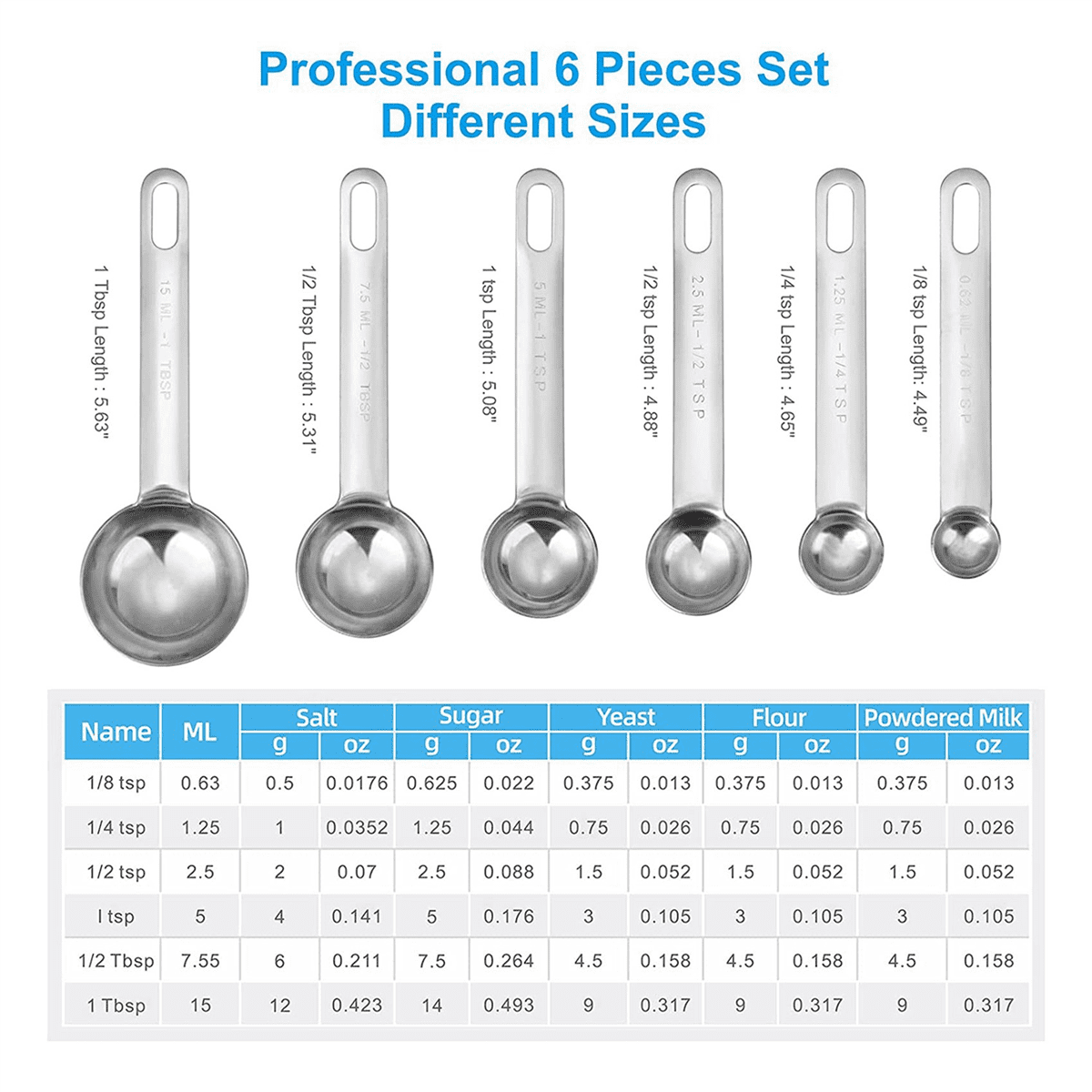 - Well-Designed 6-Pieace Set-The tablespoon set Contains 6 metal measuring spoons: 1/8 , 1/4 , 1/2 , 1 , 1/ 2 tbsp, 1 tbsp, and 1 scraper. The biggest ring allows you to nest all spoons together saving storage space, and the other two small rings help to separate some of to avoid too heavy during cooking or baking.