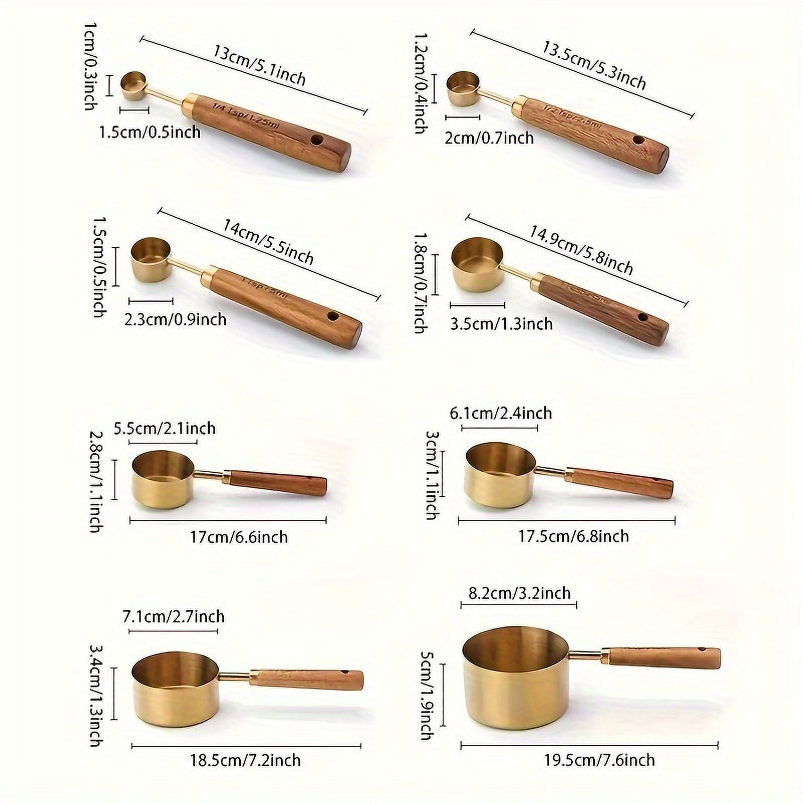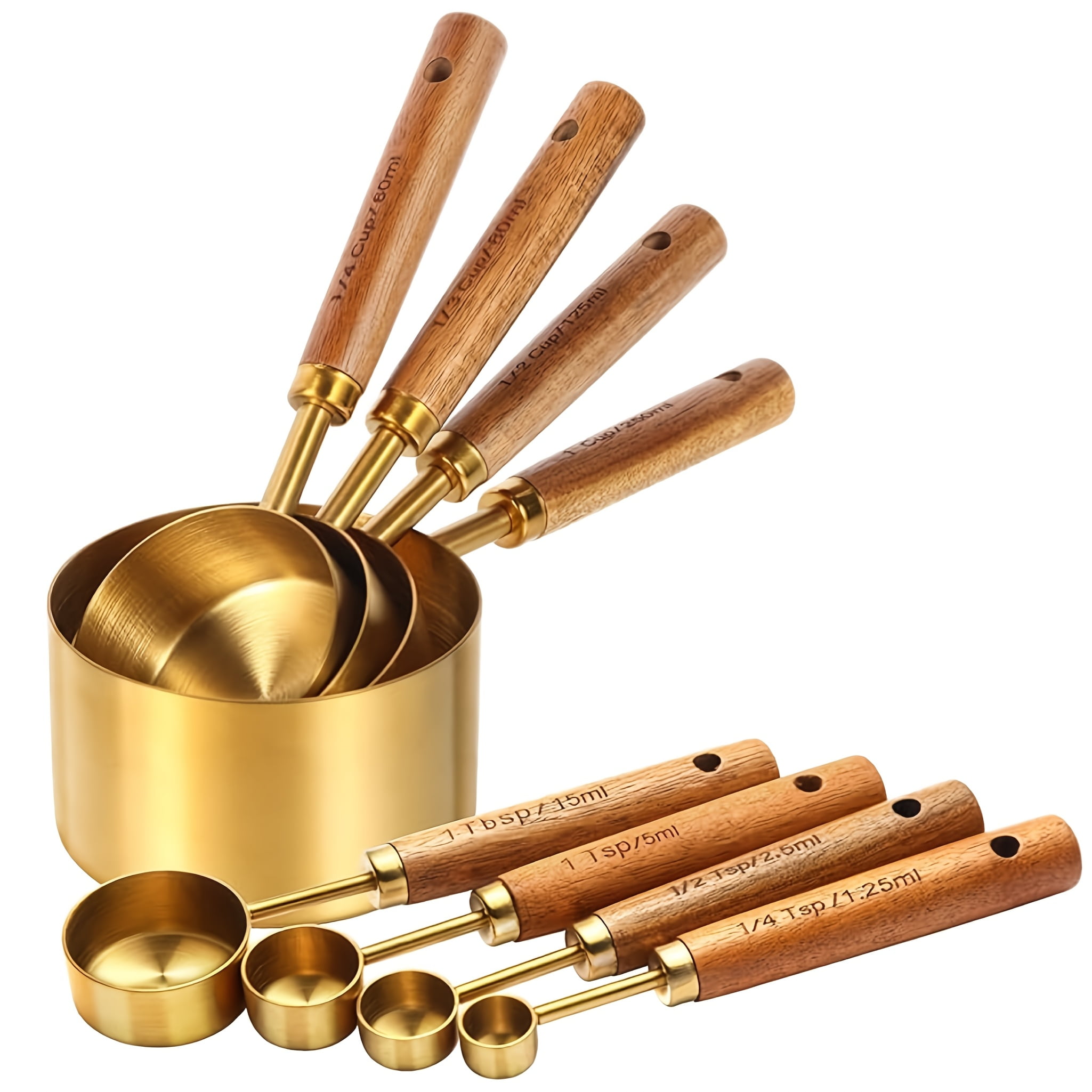 8 pieces Golden Measuring Cups Set and Measuring Spoons Set with Scale, Wooden Handle Stainless Steel Dry & Liquid Measuring Cup for Cooking Baking