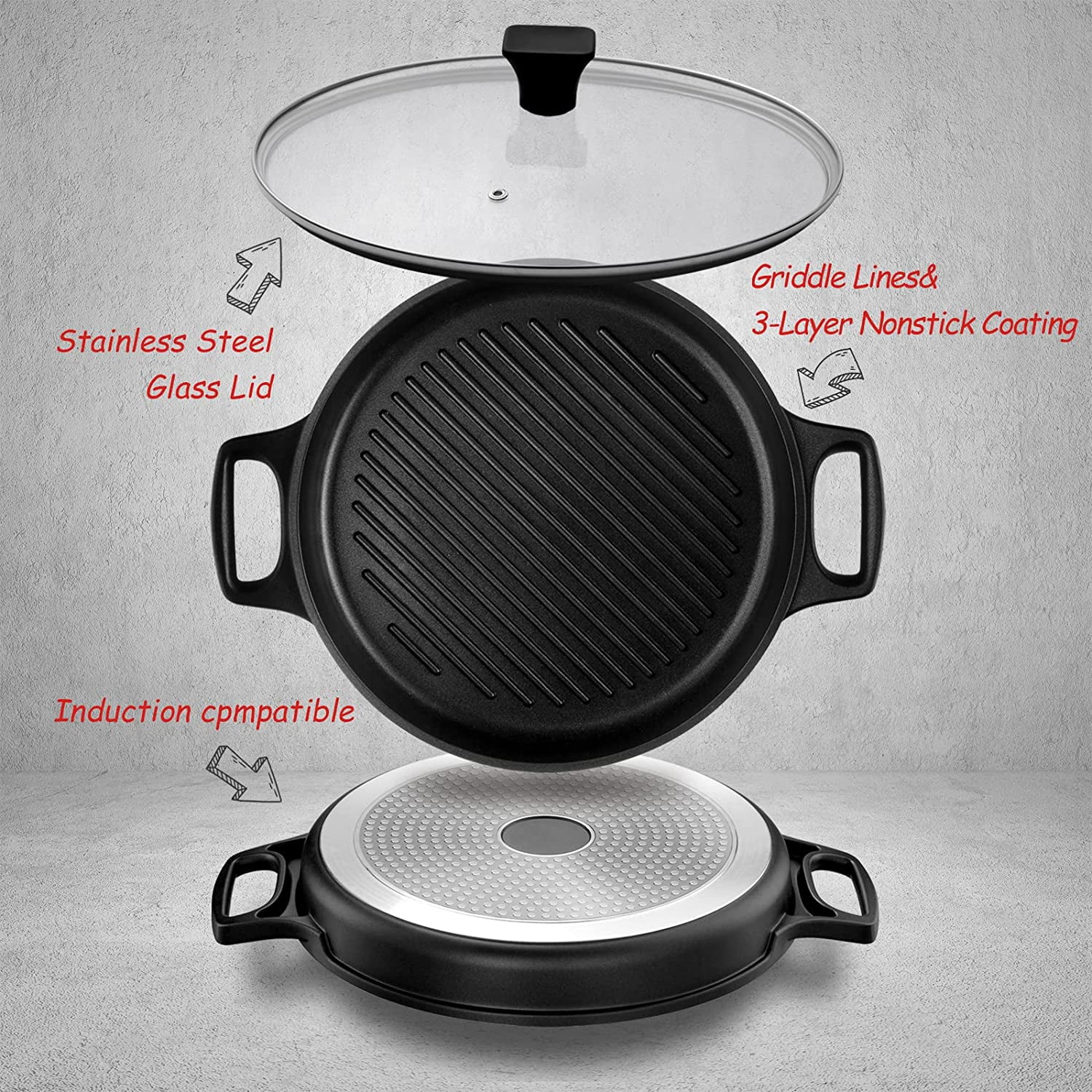 Cast Aluminum Griddle Pan with Lid – Nonstick Round Frying Pan for Stovetop, Oven Safe up to 500 ° F, Lightweight Grill Pan for Steak and Burgers