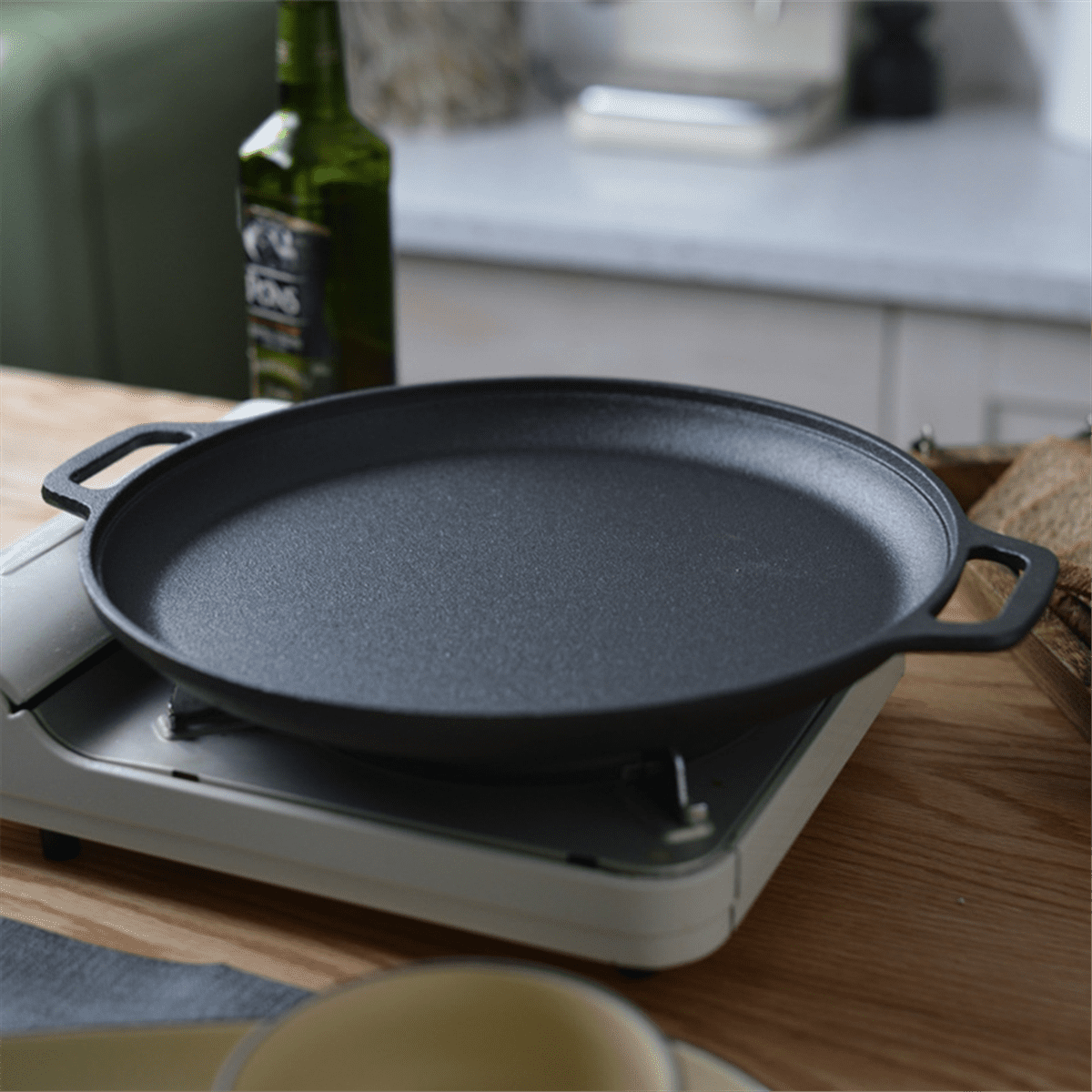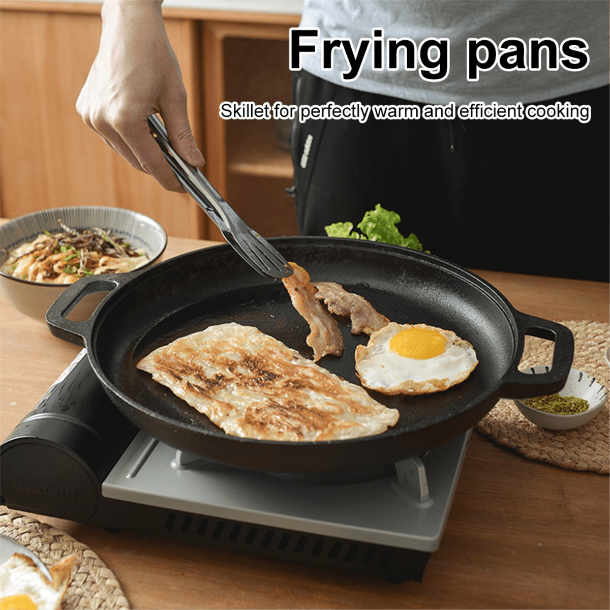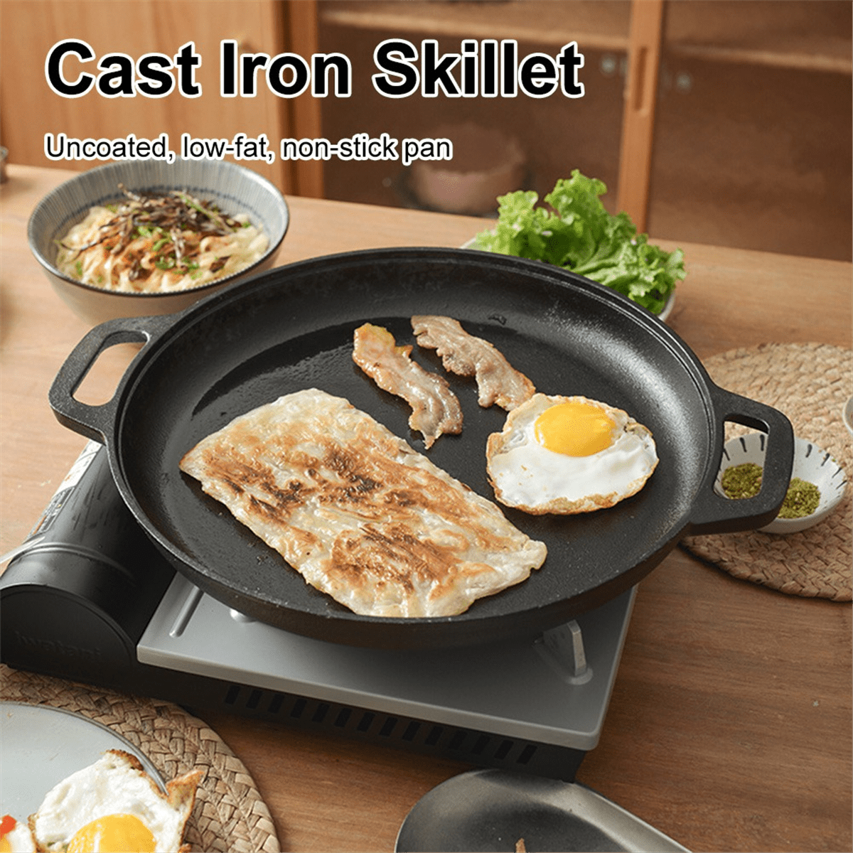 Cast Iron BBQ Camping Frying Pan, Double Handle Non-Stick Pancake Pizza Steak Pork Chicken Cooking Pan
