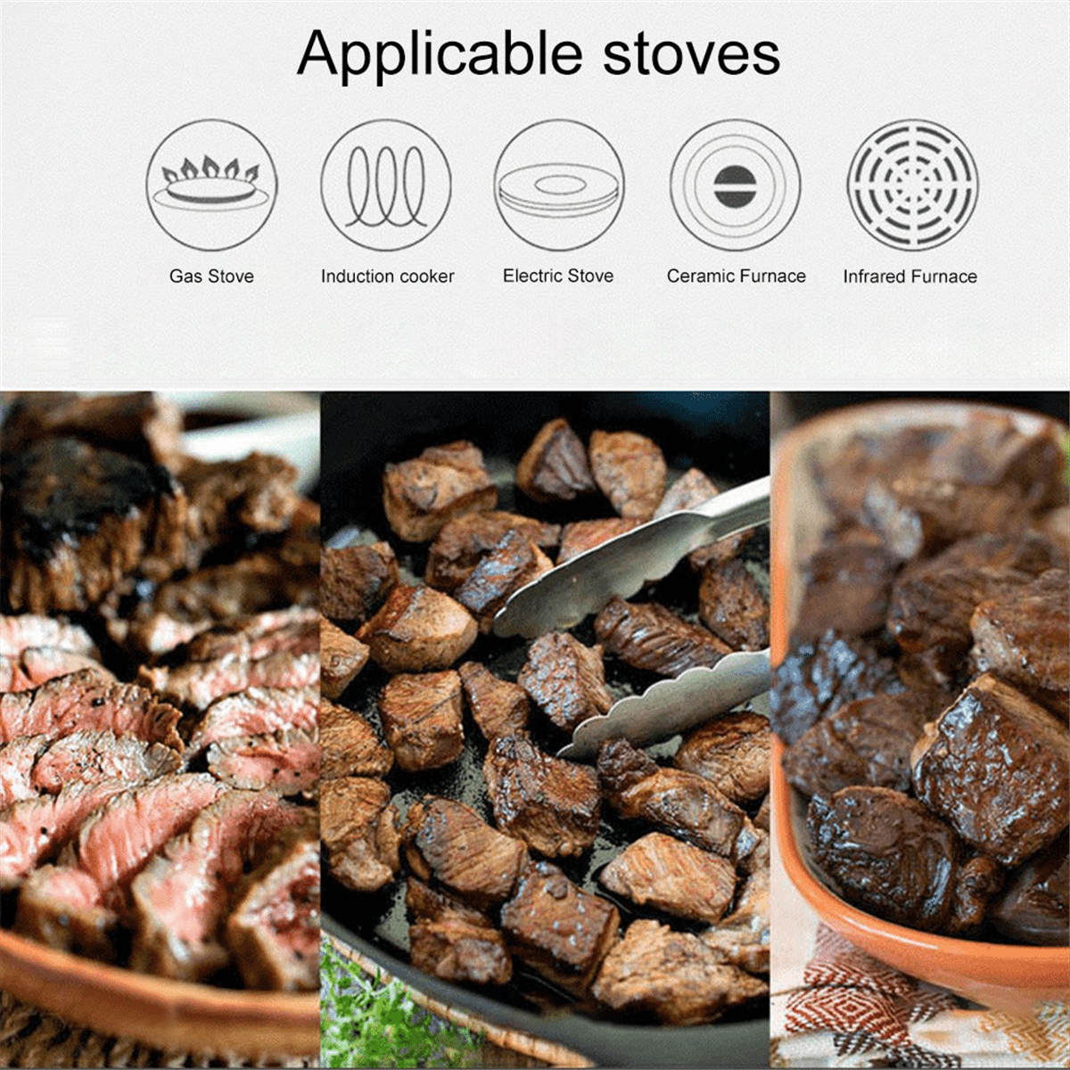 - Introducing our versatile cast iron camping skillet, designed with the home chef in mind. The non-stick is easy to cook and clean, making it perfect for making delicious dishes like pancakes, pizza, steak, pork, and chicken.