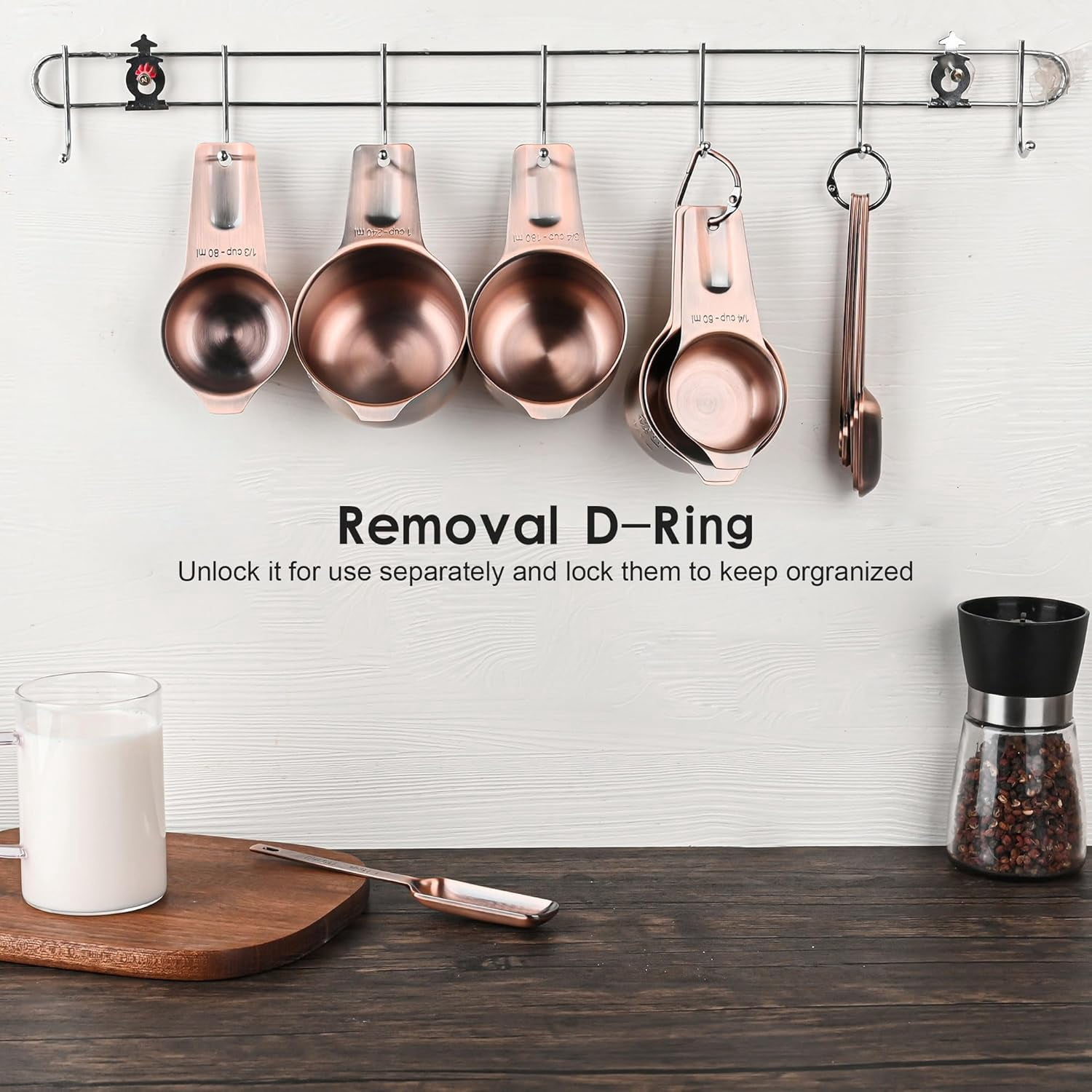 Easy to store and clean: Each copper measuring cups and each measuring spoons are stackable with a steel ring and hooked together, you can hang them or put them in a drawer for easy storage and space-saving.Clean them by hand.