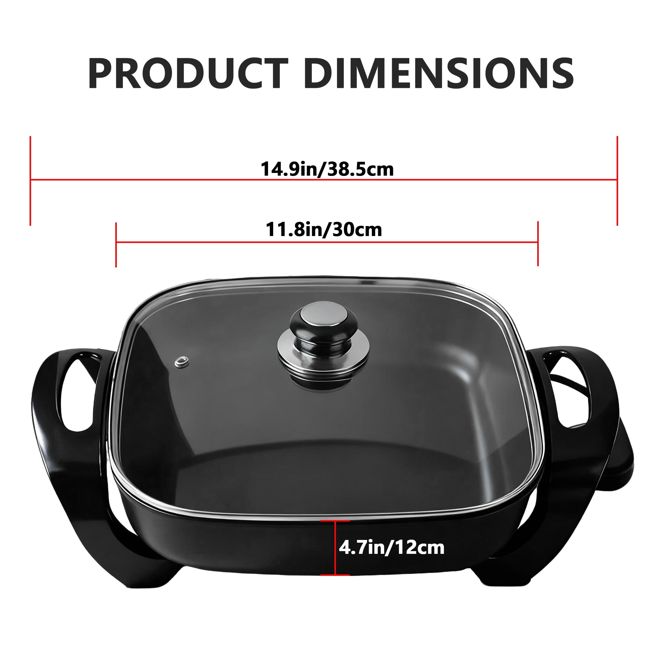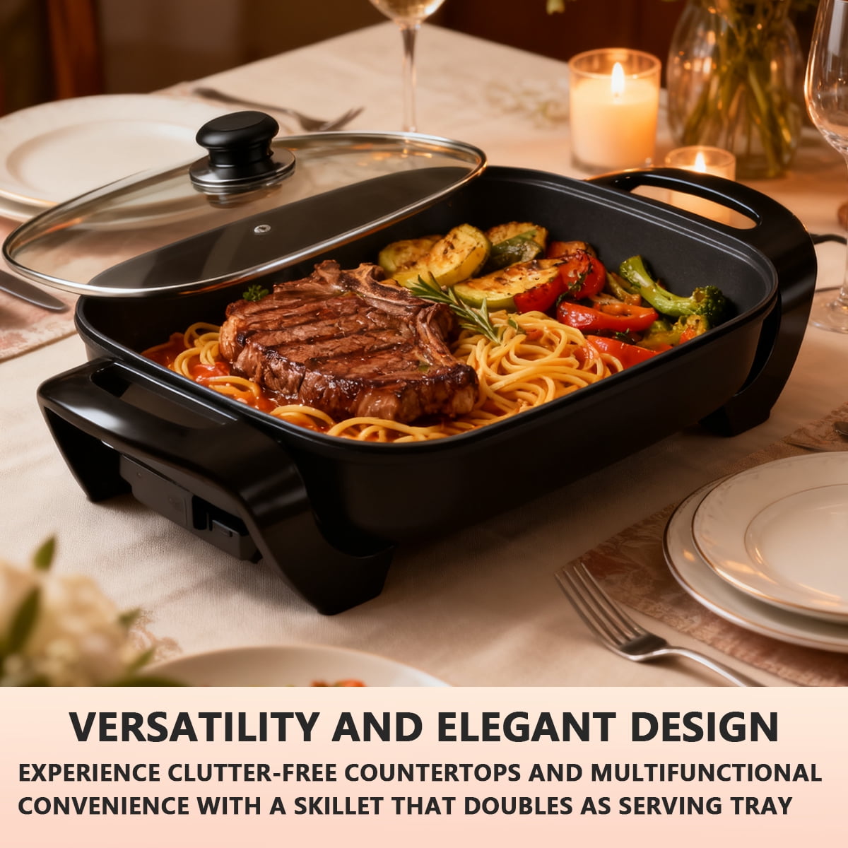 Versatile Design: This 15-inch electric skillet with a glass lid replaces multiple cookware pieces, offering space savings and simplifying daily cooking tasks.