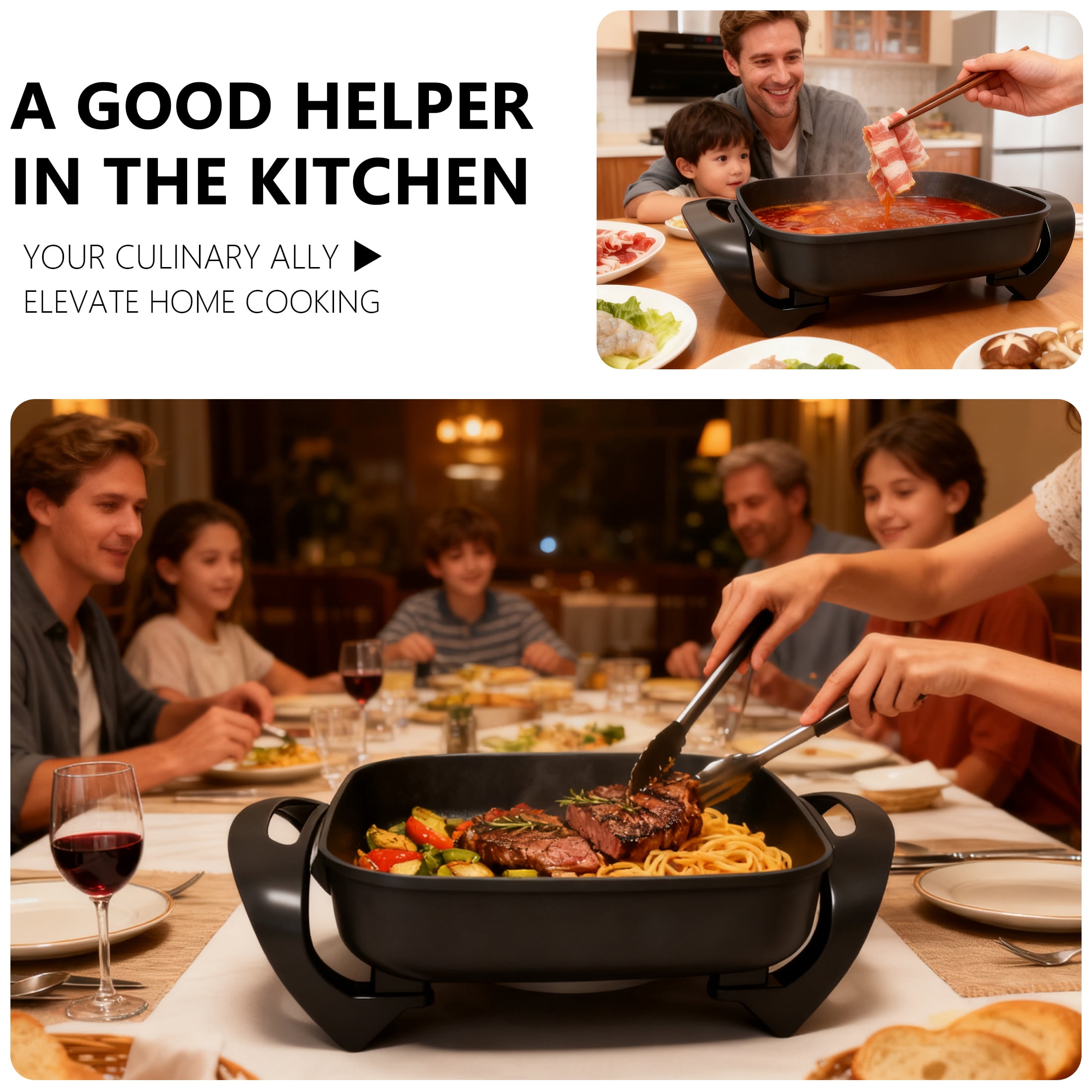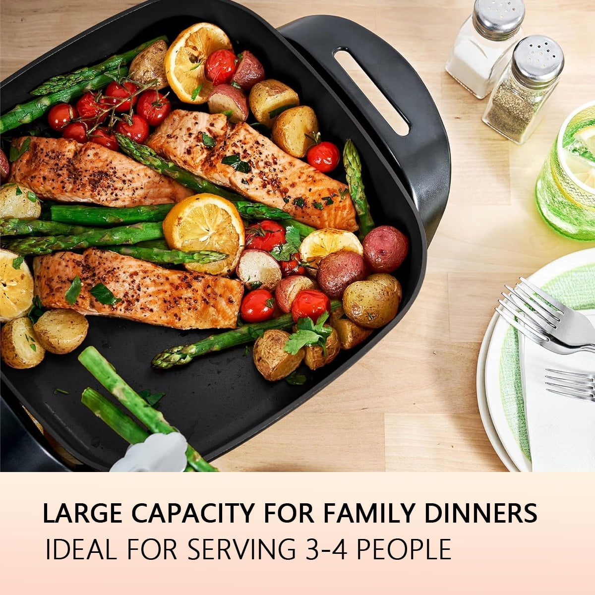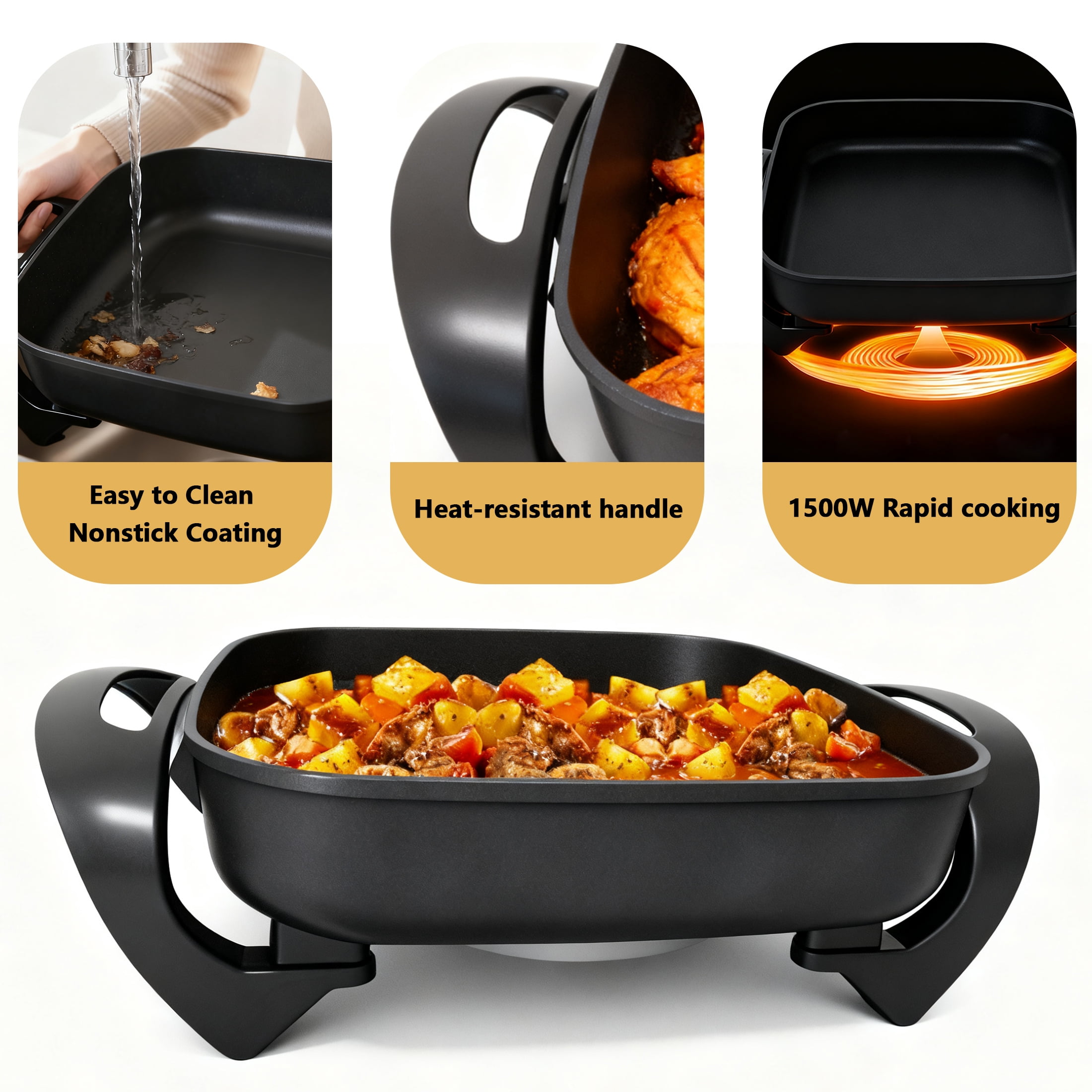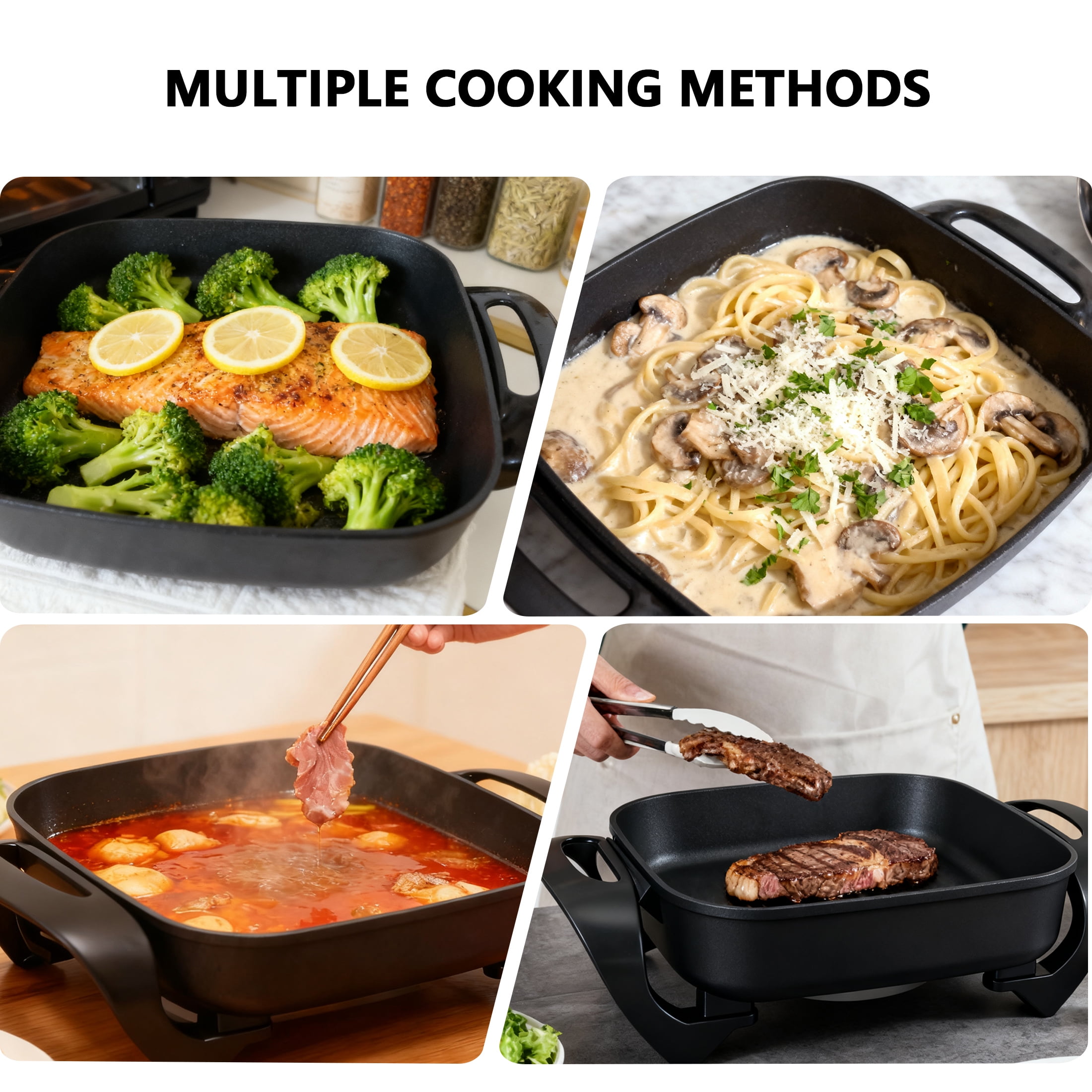 This 15-in. cast iron electric skillet with a glass lid features an extra-deep, food-grade nonstick surface for easy cooking and cleanup. It delivers efficient, uniform heating with adjustable temperature control, adapting to frying, grilling, simmering and more. The non-slip base and heat-resistant handles ensure safe, stable use, while the transparent lid locks in heat and moisture. Perfect for family meals and small gatherings, this versatile cookware simplifies daily cooking tasks.
