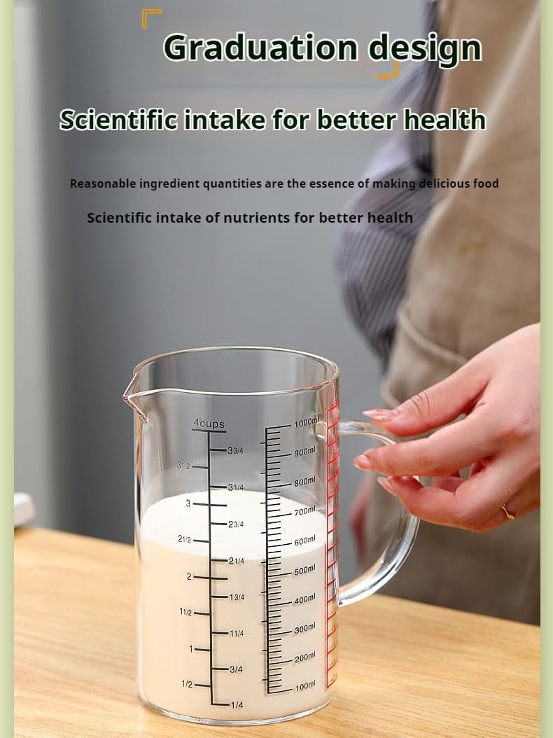 - LARGE CAPACITY: 1000 ml (34 oz/4 cups) glass measuring cup perfect for measuring and pouring liquids, with three different measurement scales for versatile use