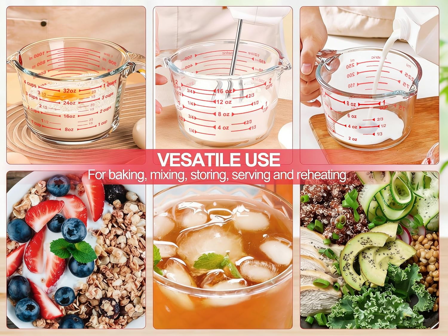 - Convenient Features: Equipped with a large, sturdy handle and a curved spout for precise, mess-free pouring, along with clear measurement markings in cups, ounces, and milliliters.