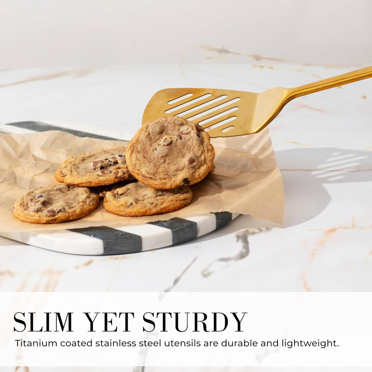 - Complete 13-Piece : Includes gold stainless steel cooking utensils (spoon, pasta fork, spatula, skimmer, ladle) plus an 8-piece measuring cup and spoon set with markings for precise baking and cooking.