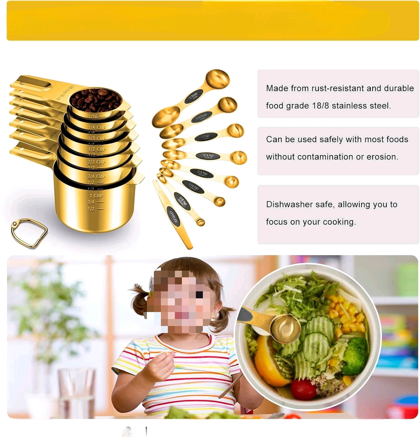 Stainless steel surfaces wipe clean and are safe for placement in the dishwasher after measuring sticky or dry ingredients. Avoid prolonged exposure to acidic or alkaline substances and keep the pieces dry to maintain the gold tone.