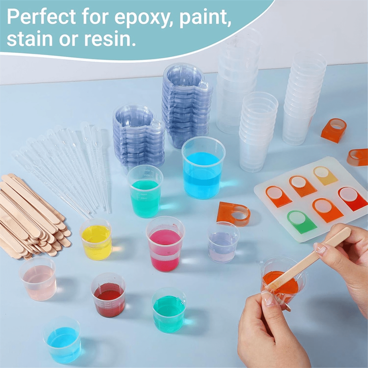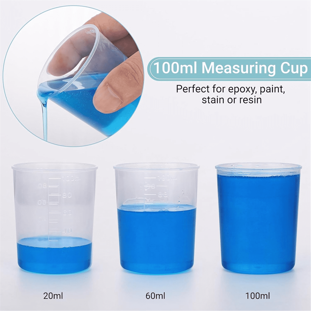 - Multi-use – The clear epoxy mixing cups with stirring sticks are perfect for handmade , scientific experiments, painting, cosmetic making, etc. It is the perfect tool for measuring and mixing resins, epoxy, stain, paints, dispensing liquids, powders, etc.