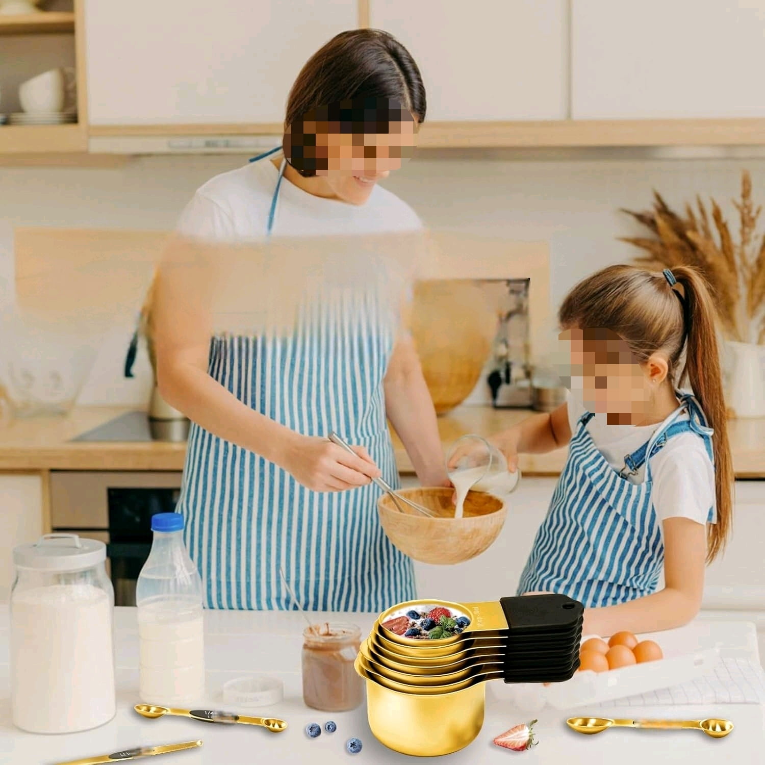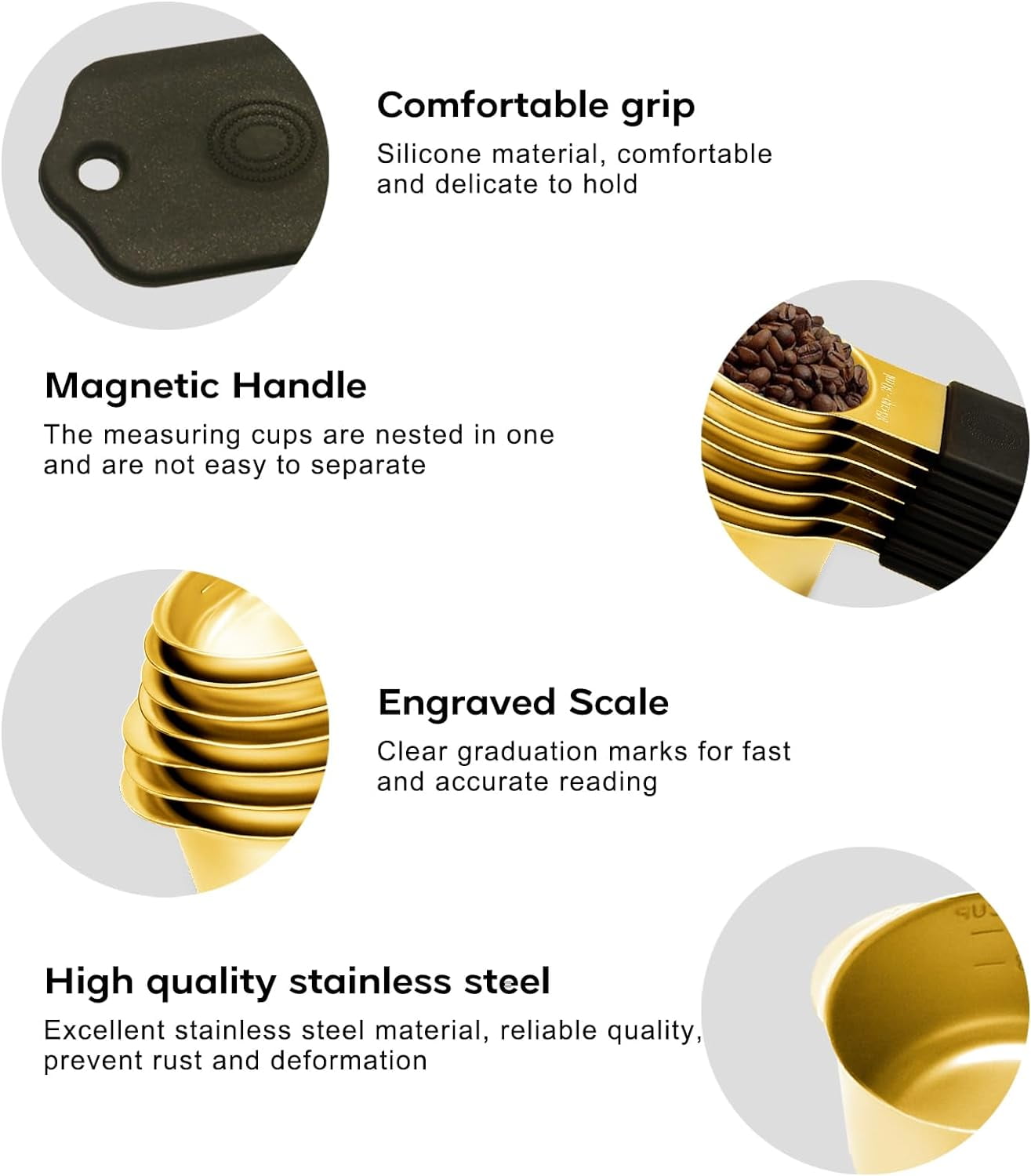 This product is a set of magnetic measuring cups and spoons designed for cooking and baking. It includes 7 stainless steel nesting gold measuring cups and 8 magnetic gold measuring spoons with a leveler.
