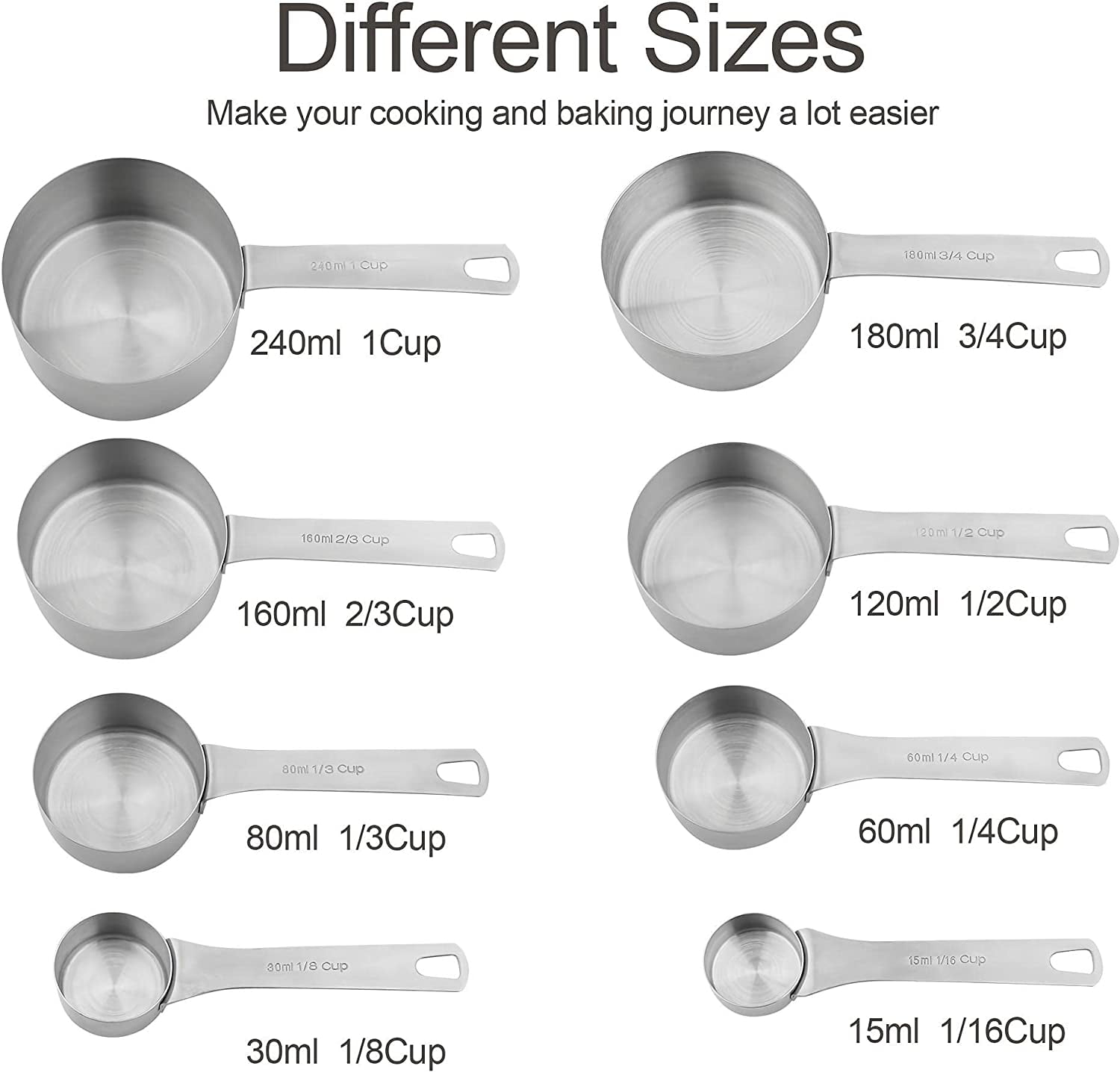 Measuring Cup Set of 8, 18/8 Stainless Measuring Cups for Kitchen & Baking, Metric & Measure Cups Set with 2/3 Cup & 3/4 Cup Meaure Cups