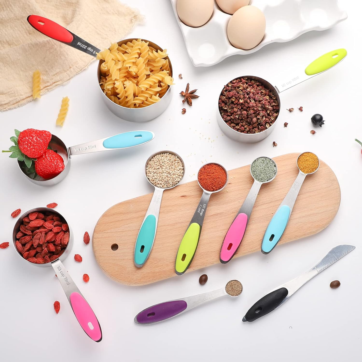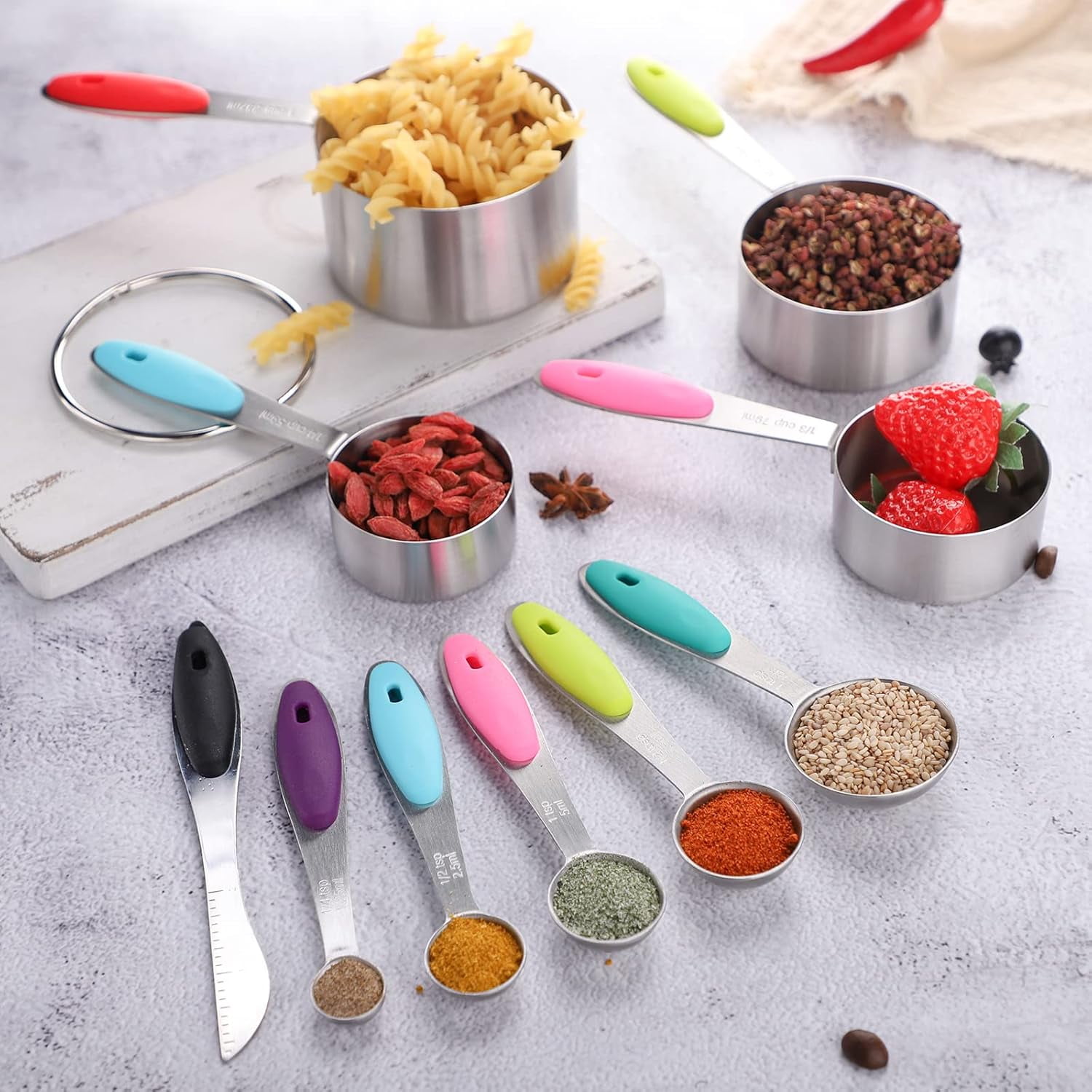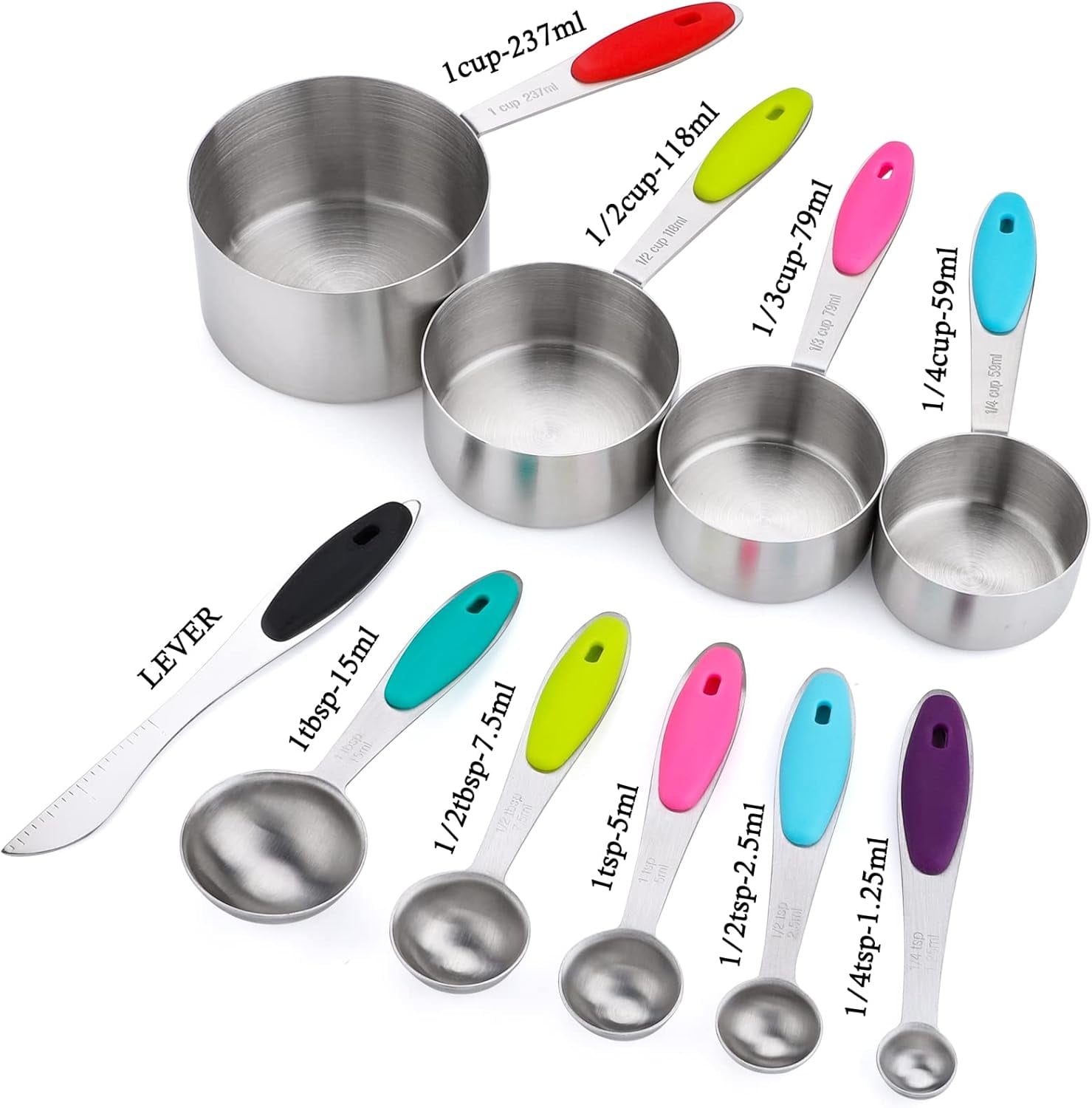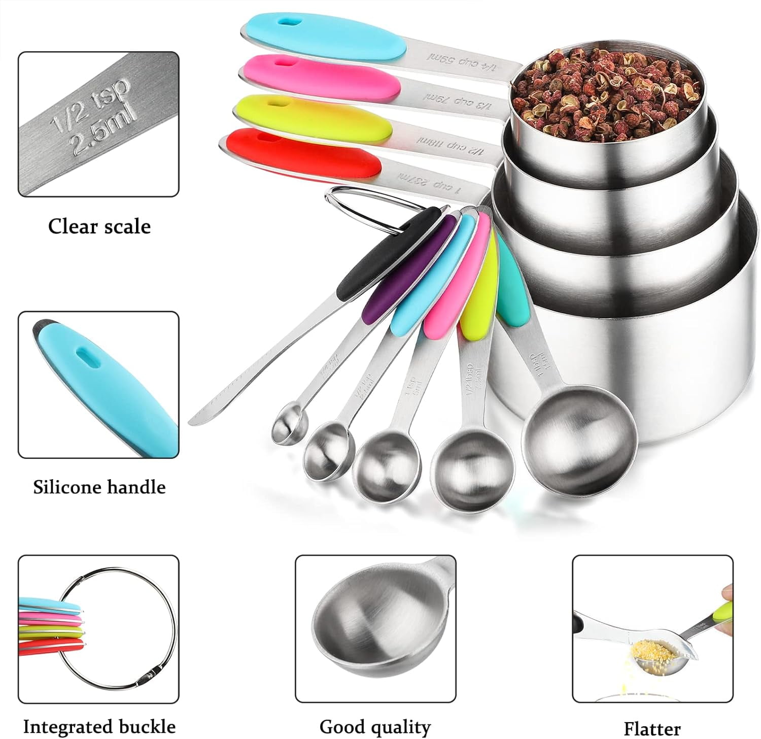 - Silicone Handle:This stainless steel measuring cups and spoons set of handles are embedded with silicone strips,comfortable grip,and different colors can be identified, practical and cute set of stainless steel measuring tools.