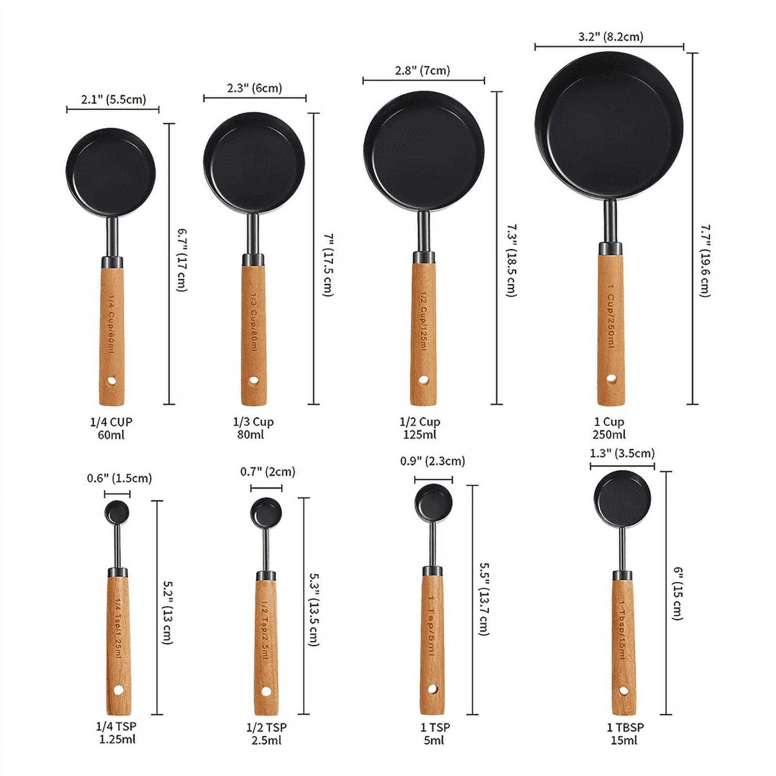 - 8 Pieces Set Included: 4 size measuring cups 1/4 Cup-60 ml, 1/3 Cup-80 ml, 1/2 Cup-125 ml, 1 Cup-250 ml; and 4 size measuring spoons 1/4 -1.25 ml, 1/2 -2.5 ml, 1 -5 ml, 1 tbsp-15 ml
