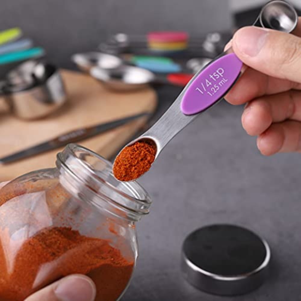 [Measuring Cup and Spoon Set]This set include 8 Measuring cups(1 cup, 3 / 4 cup, 2 / 3 cup, 1 / 2 cup, 1 / 3 cup, 1 / 4 cup, 1 / 8 cup, 1 / 16 cup),9 Measuring Spoons(1/16 tsp, 1/8 tsp, 1/4 tsp, 1/2 tsp, 3/4 tsp, 1 tsp, 1/2 tbsp ,1 tbsp)&1 leveler.This measuring cups and spoons set made of high quality stainless steel. [Magnetic Spoon]This set of measuring spoons is made of high quality stainless steel,and middle of spoon is double-sided magnetic.So can be stacked and easy to store.The magnetic force between them will not be messed up on the table after you use it up.Dry or liquid ingredients can be used on both sides of the measuring spoons.The leveler help you smooth out the amount you need. [Measuring Cup]The measuring cups set made of high quality stainless steel,and the cup handle is not easy to break.Rugged and durable.And the handle of this measuring cup is embedded with silica gel, which makes it comfortable to use without slipping your hands.Both dry or liquid ingredients can be used.Easy to clean. [Accurate Calibration]Each cup and spoon is engraved with us and metric measurement marks, which is easy to read and allows you to determine the quantity when cooking. The clear and bright color of the handle will help you easily identify the cup you need. [USE WIDELY]The measuring cups and spoons set can use for liquids and dry ingredients.when you cooking meal,you can use it measure spices and for baking be measure flour.