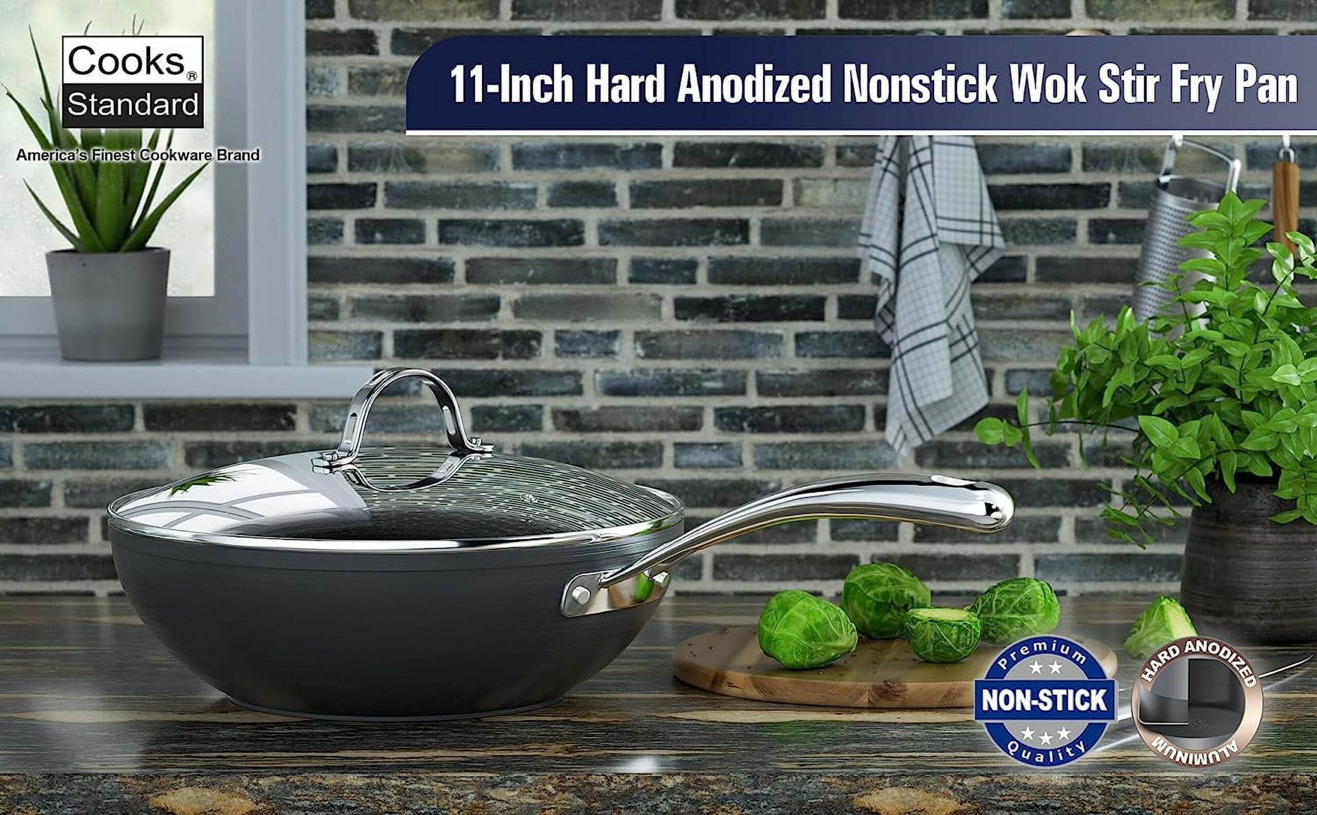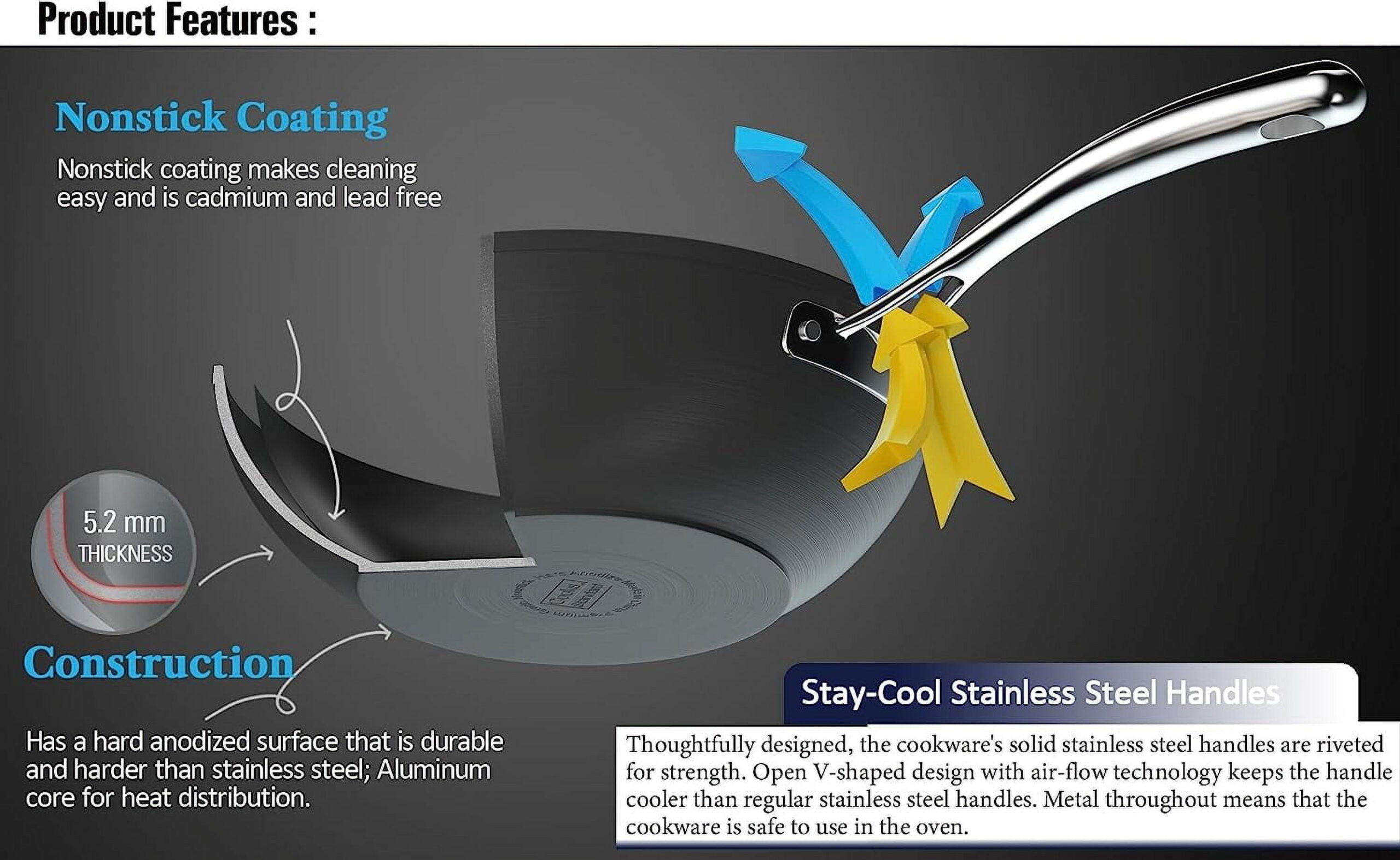 - Nonstick Wok Pan: Easy to clean with durable nonstick coating and hard anodized construction
