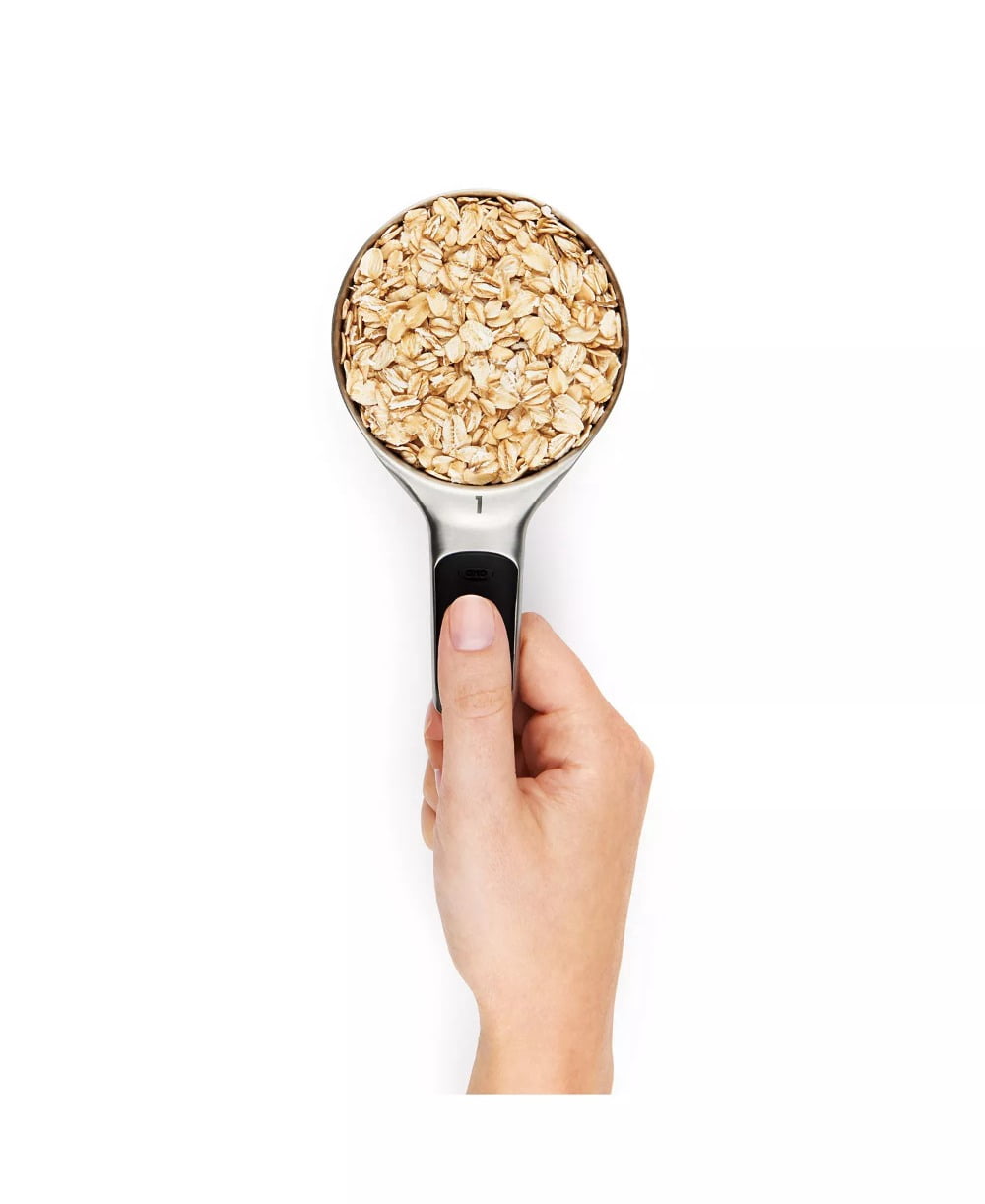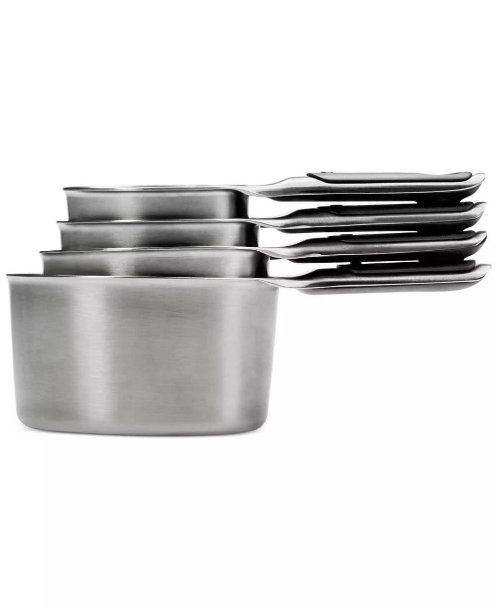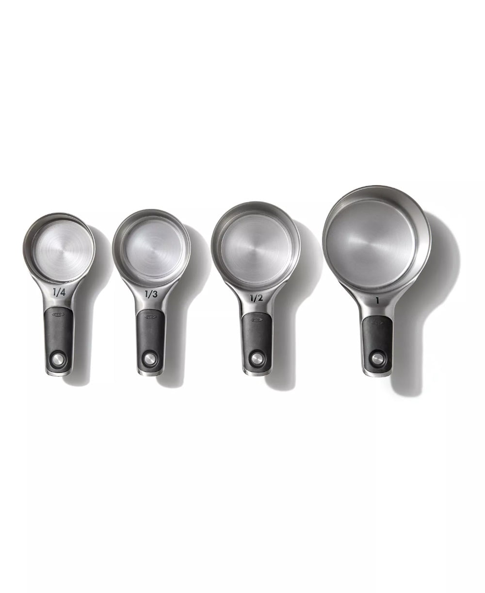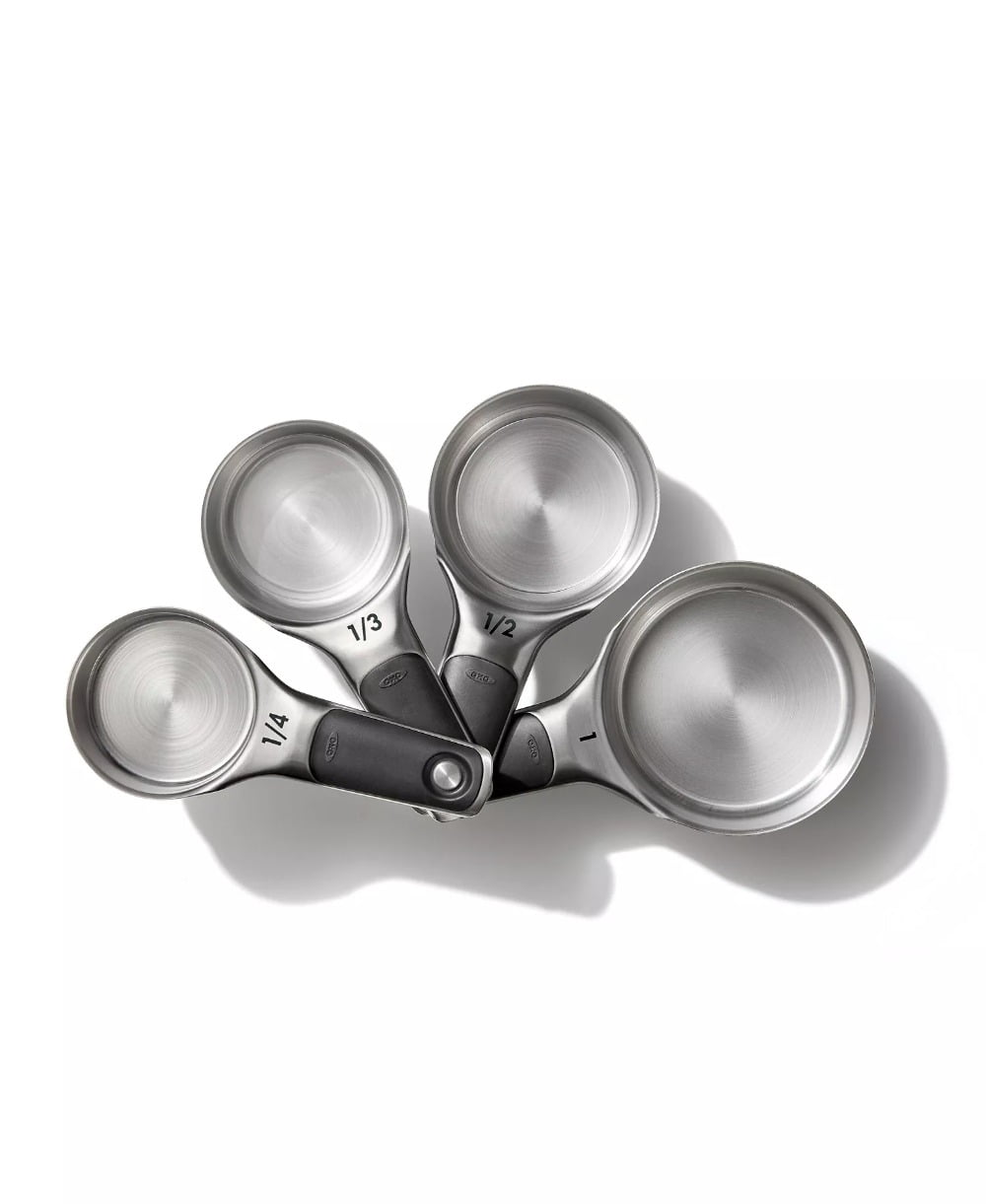 - 4-piece set includes: 1/4-cup measuring cup, 1/3-cup measuring cup, 1/2-cup measuring cup & 1-cup measuring cup