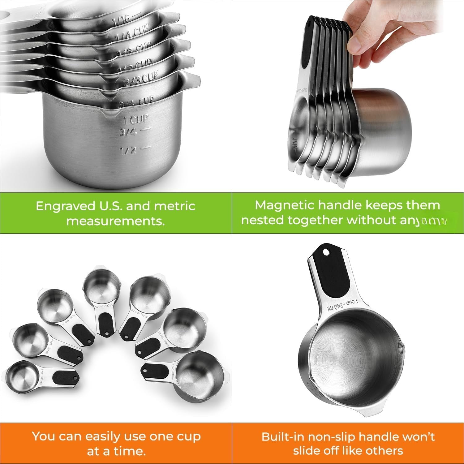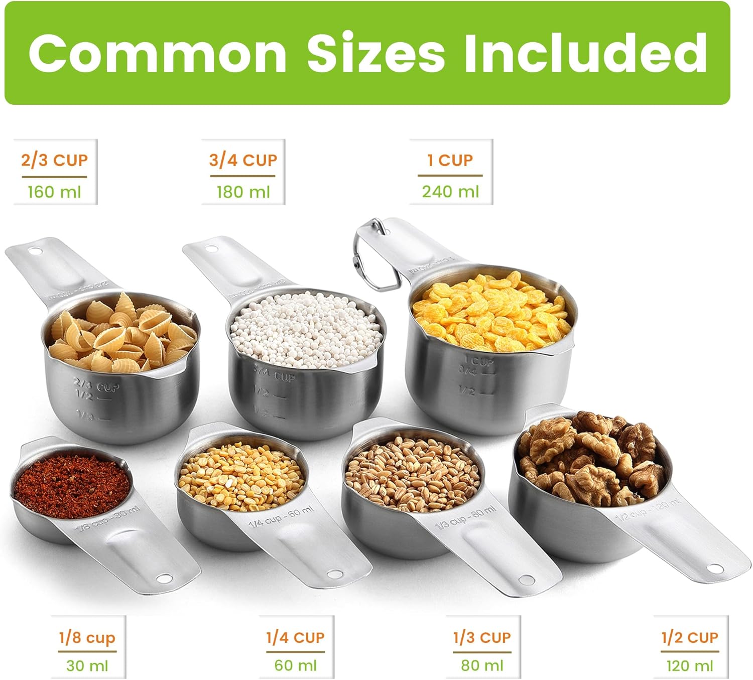 - Complete Set Of Kitchen Measuring Cups With The Common Sizes You Need – You’ll be able to make almost anything with the included sizes – 1/8 cup, 1/4 cup, 1/3 cup, 1/2 cup, 2/3 cup, 3/4 cup, and 1 cup a ring. You won’t realize how useful they are until you have them.