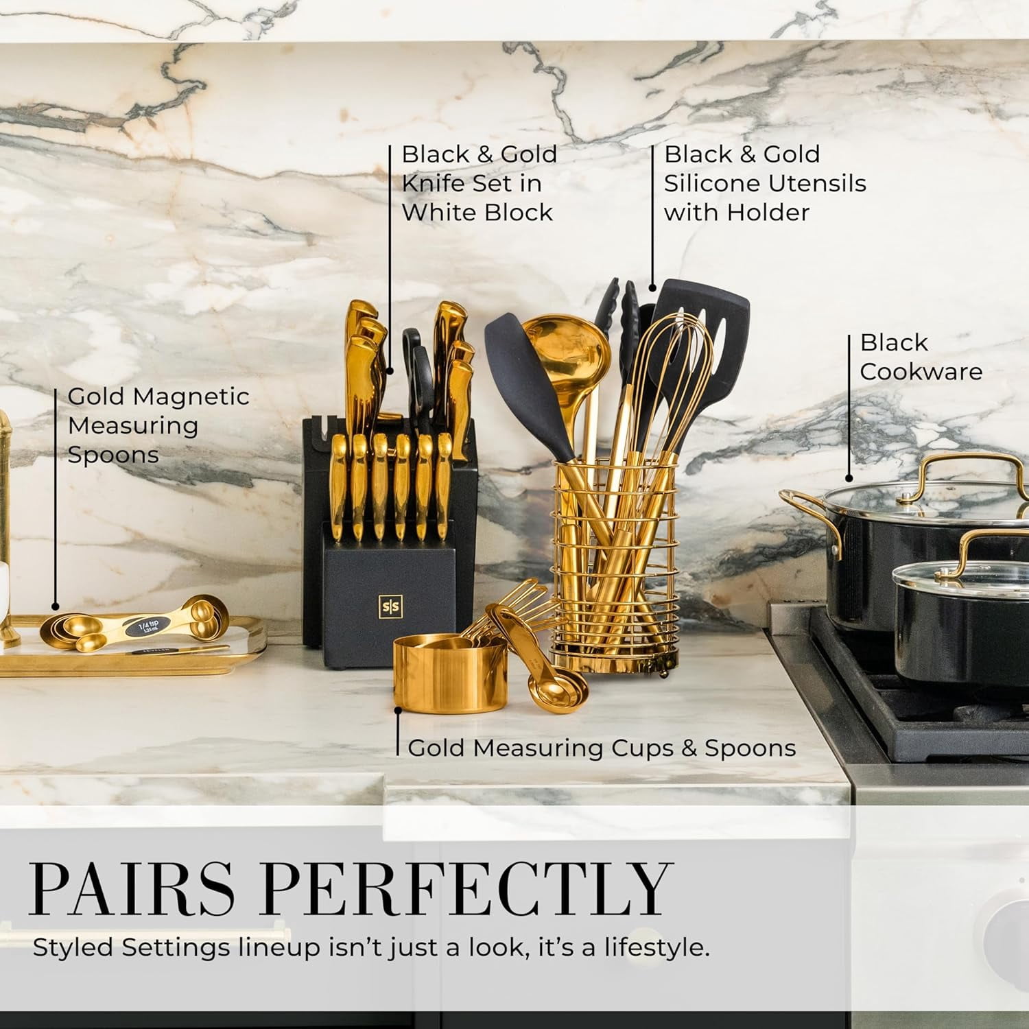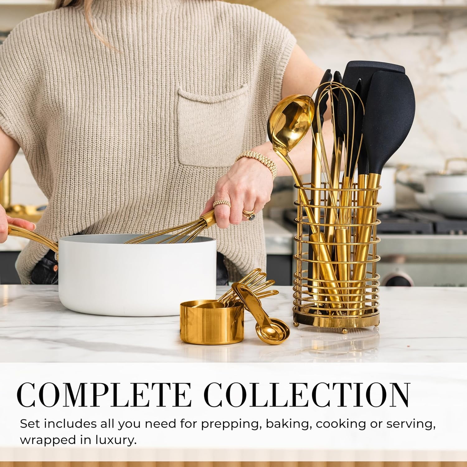 - Complete 15-Piece Luxury Set: Includes a full range of black and gold cooking utensils such as ladle, tongs, serving spoon, slotted turner, whisk, and spatula, plus a matching gold utensil holder for organized storage.